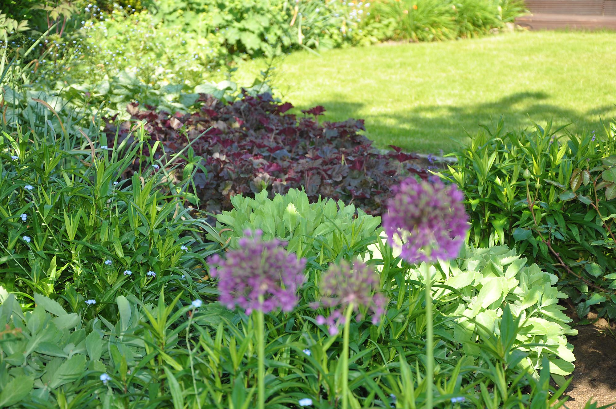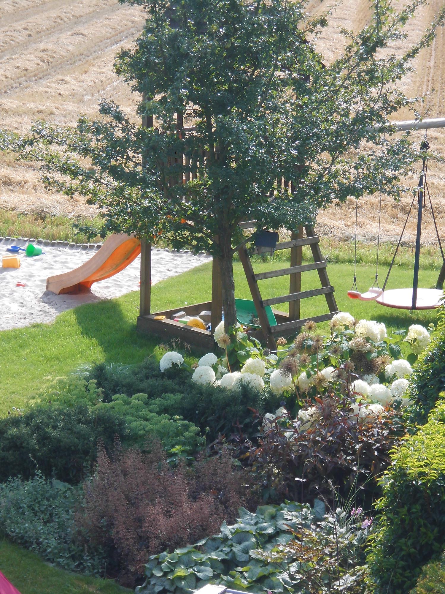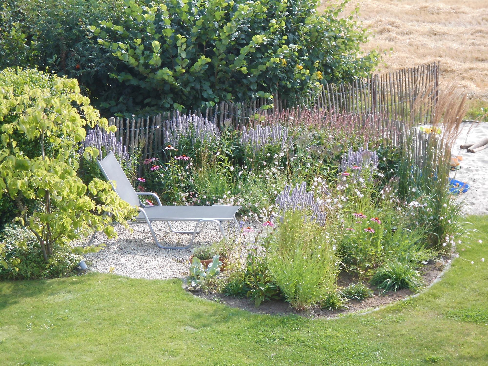 Der Garten der Familie aus Bocholt wurde umgestaltet. Es entstand ein großer Spielbereich sowie ein sonniger Platz für einen Liegestuhl, abgeschirmt durch ein schönes Staudenbeet in Wildwiesenoptik. Außerdem gibt es am kleinkronigen Hausbaum ein attraktives Staudenbeet im Halbschatten.