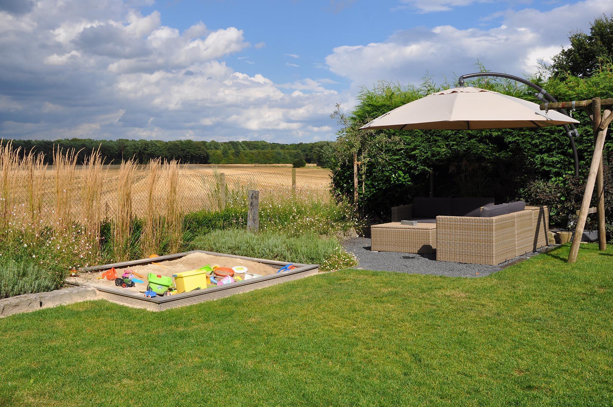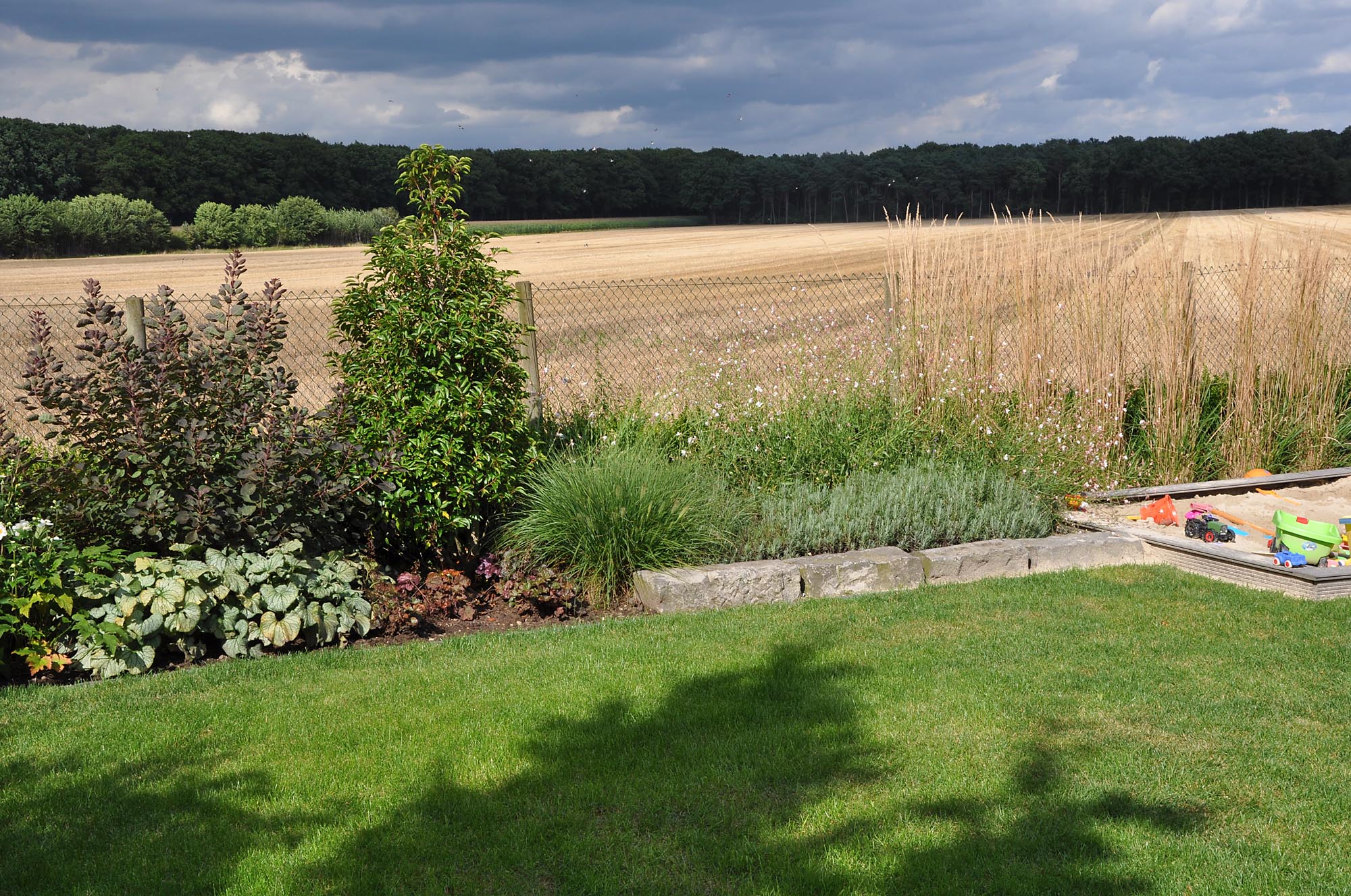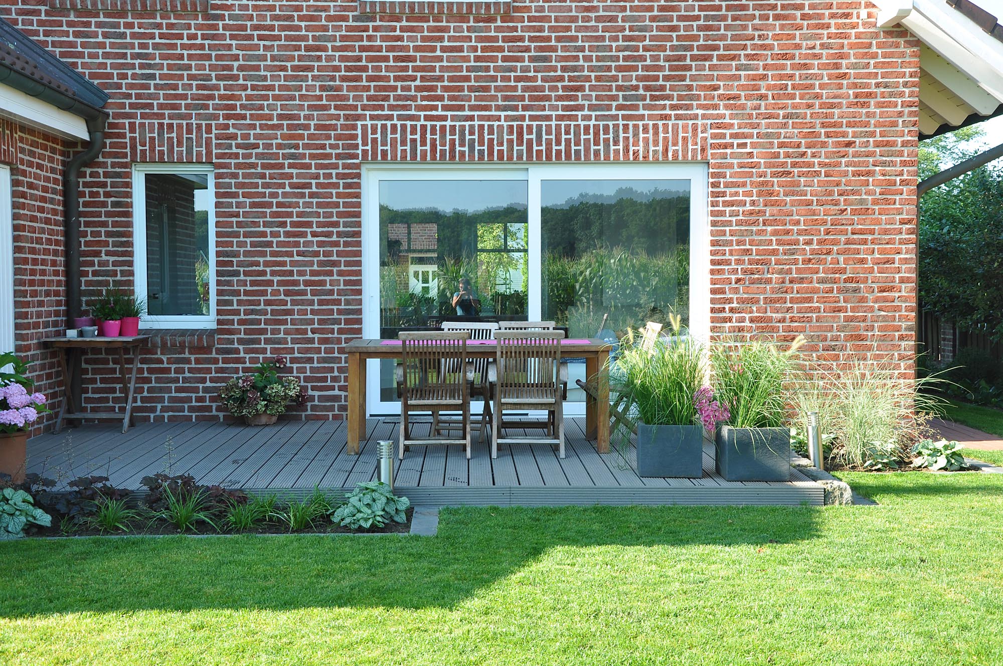 Direkt am Haus wurde eine Holzterrasse eingeplant – eingefasst durch Beete. Im hinteren Gartenteil gibt es nun noch einen weiteren Sitzplatz, um die Abendsonne zu genießen. Wird der Sandkasten für die Kleinsten irgendwann nicht mehr benötigt, kann er gut zur Beetfläche umfunktioniert werden. Ein attraktives Pflanzkonzept aus Sträuchern, Stauden und Gräsern runden diese Planung für die Familie in Bocholt ab.
