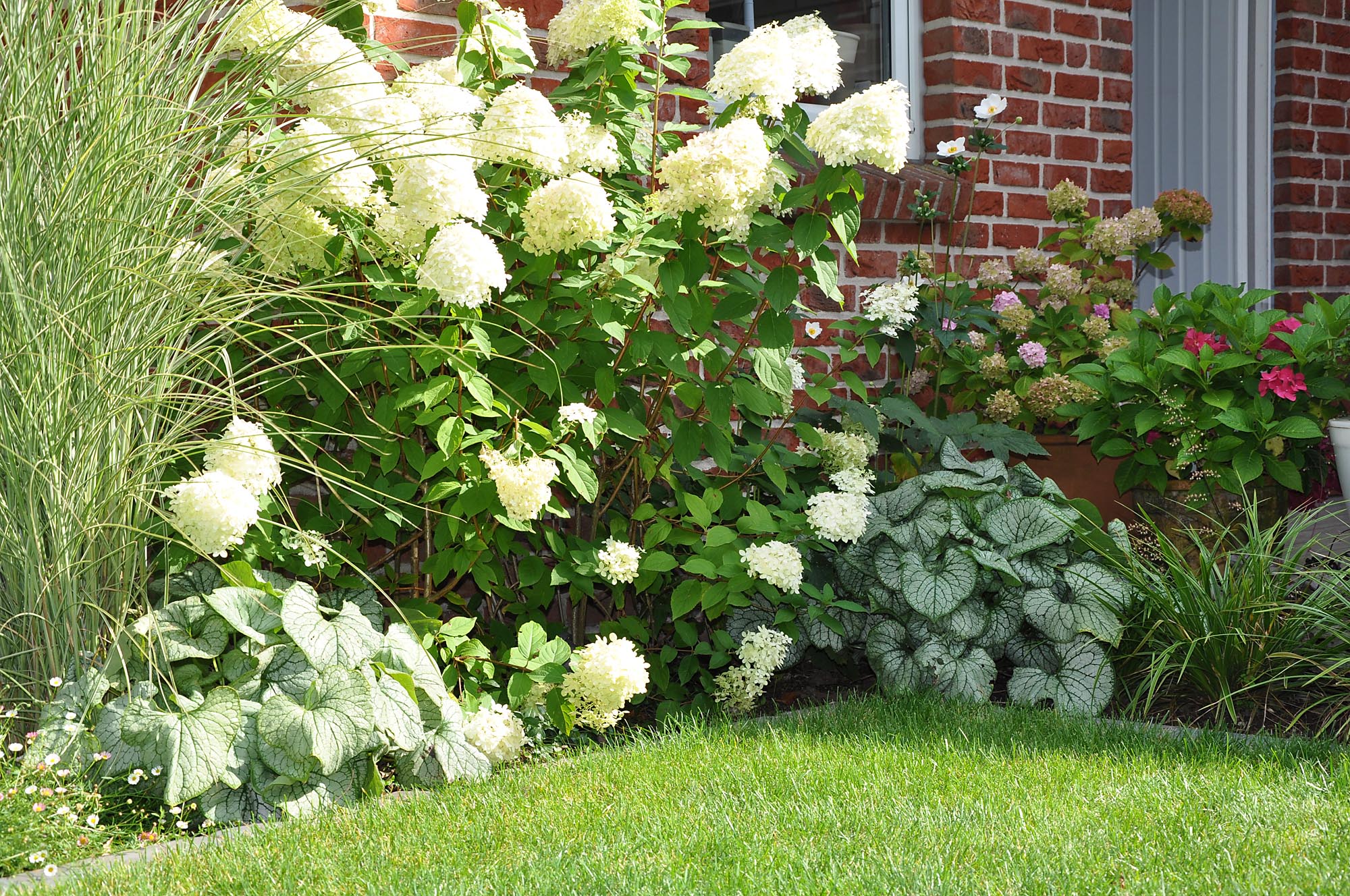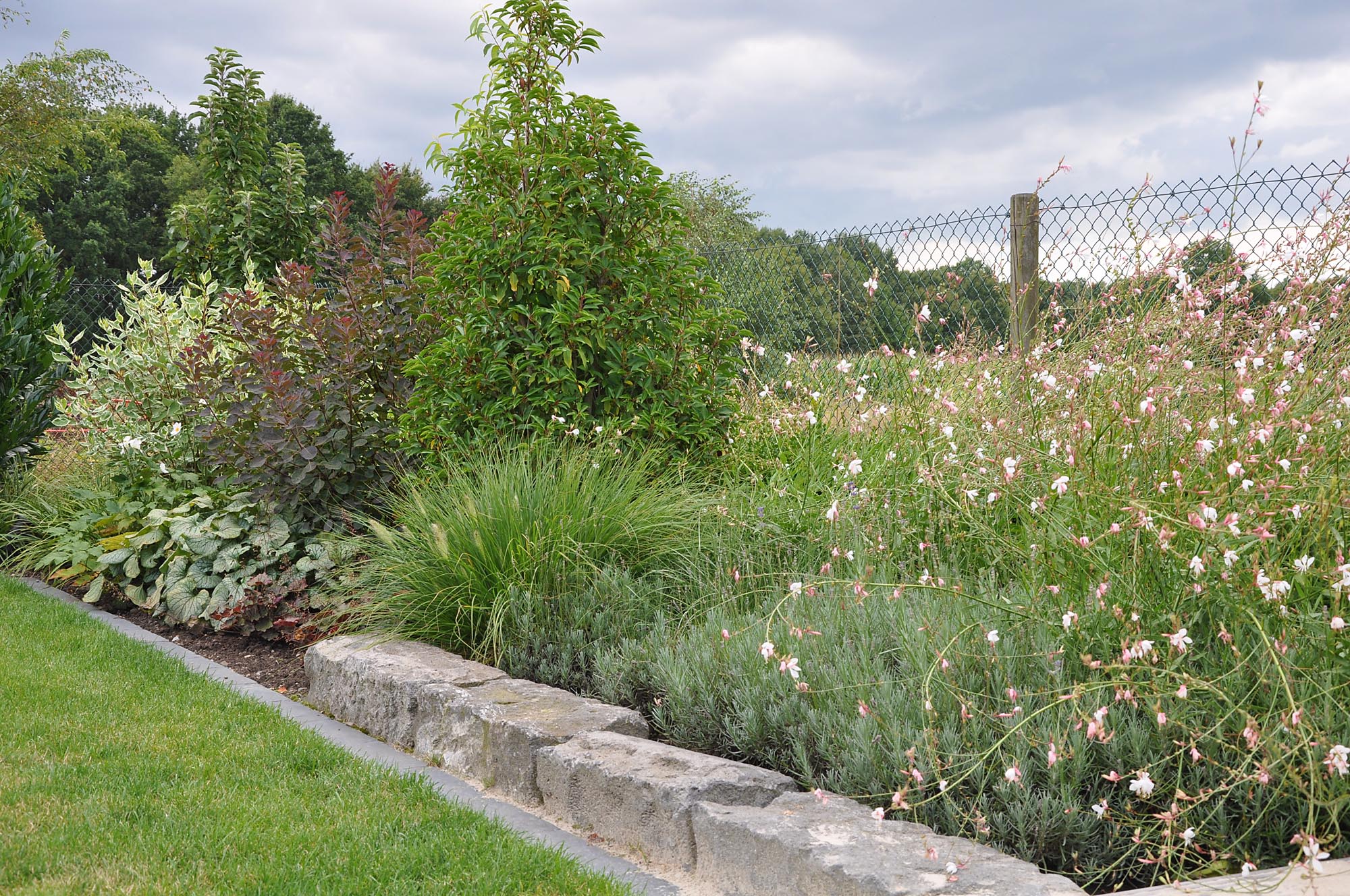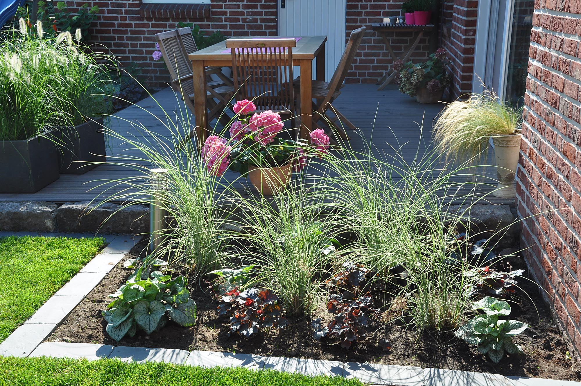 Direkt am Haus wurde eine Holzterrasse eingeplant – eingefasst durch Beete. Im hinteren Gartenteil gibt es nun noch einen weiteren Sitzplatz, um die Abendsonne zu genießen. Wird der Sandkasten für die Kleinsten irgendwann nicht mehr benötigt, kann er gut zur Beetfläche umfunktioniert werden. Ein attraktives Pflanzkonzept aus Sträuchern, Stauden und Gräsern runden diese Planung für die Familie in Bocholt ab.