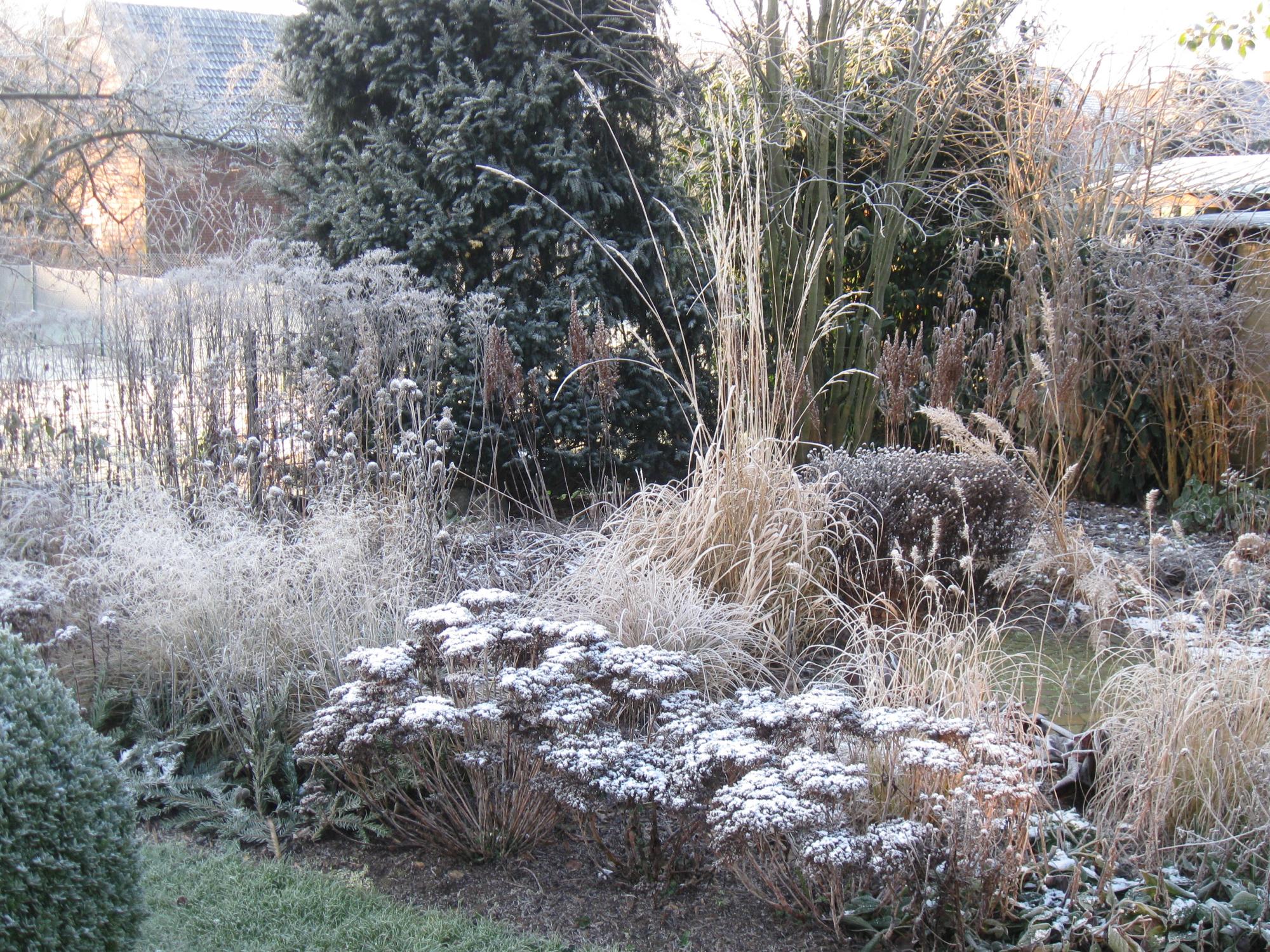 Bereits im ersten Jahr hatte ich die erste Freude an dem großartigen Ergebnis, einen Garten nach meinen Vorstellungen, mit einem Teil meiner auserwählten Altpflanzen und vielen Gräser. Besonders bemerkenswert ist der sogenannte Winteraspekt. Da der Garten erst im Frühjahr geräumt wird, bietet er auch in den Wintermonaten, insbesondere mit Schnee oder Raureif, ein imposantes Gartenbild.