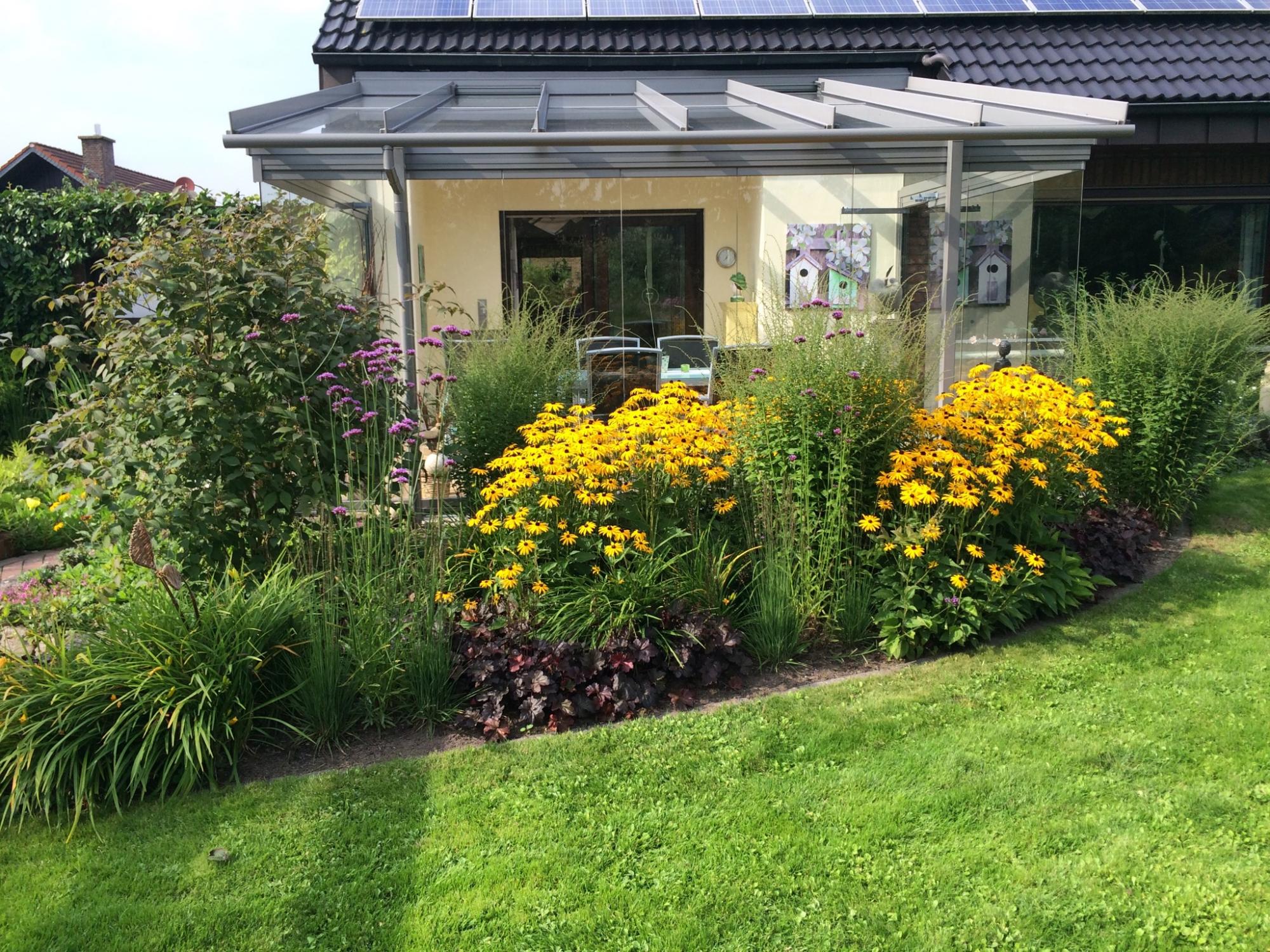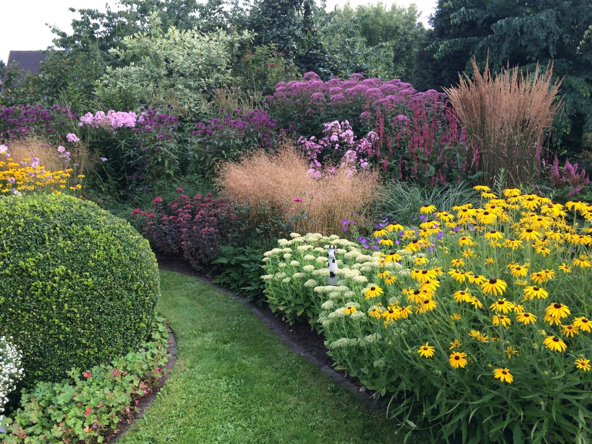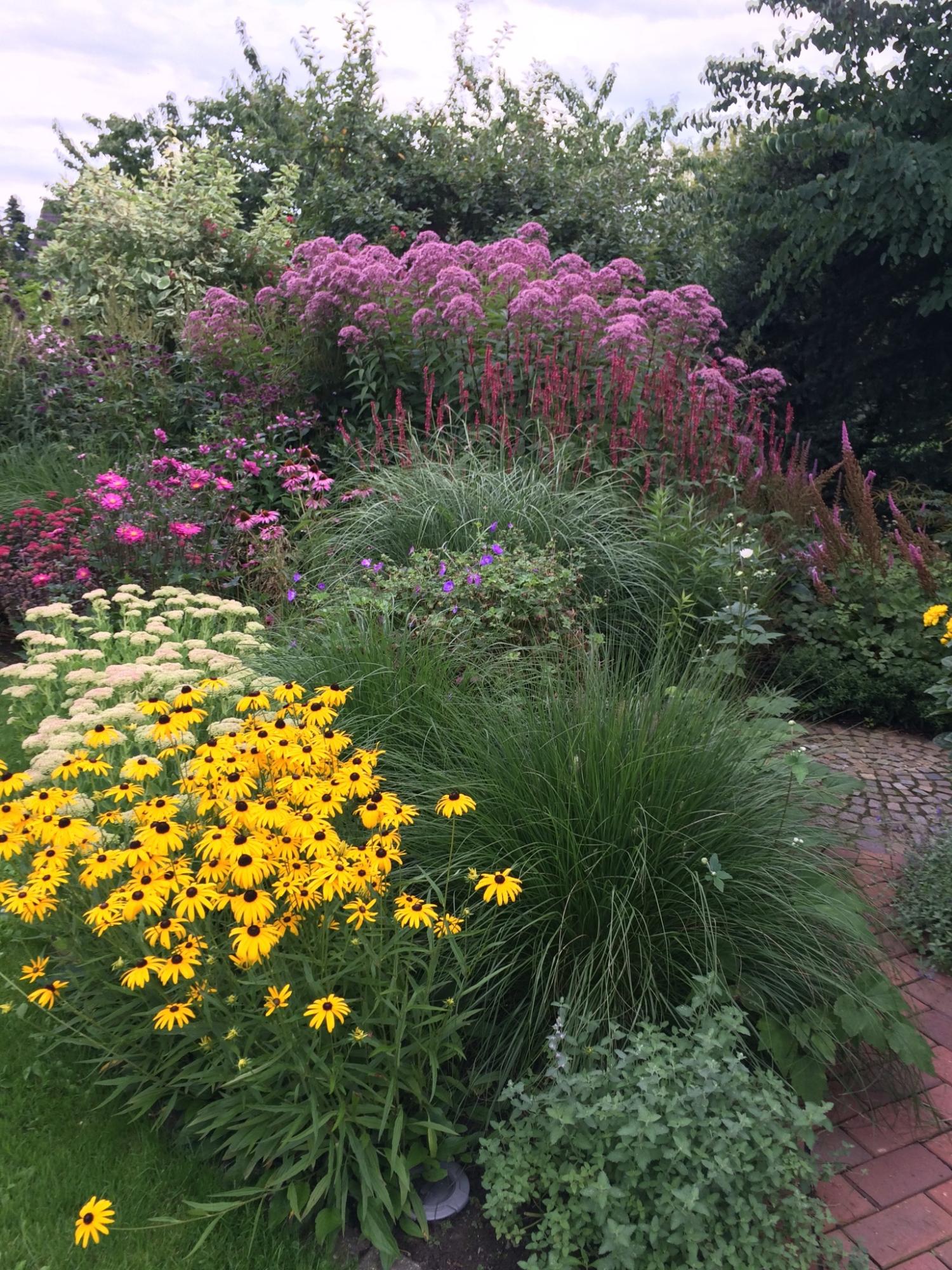 “In der Vorausschau auf meinen beginnenden Ruhestand habe ich 2014 mit der Planung begonnen. Ausgehend von einem Gartentyp “Bauerngarten” und der Inspiration durch mehrere Bücher über Präriegärten und die Verwendung von Gräsern habe ich diesen Gedanken umgesetzt.