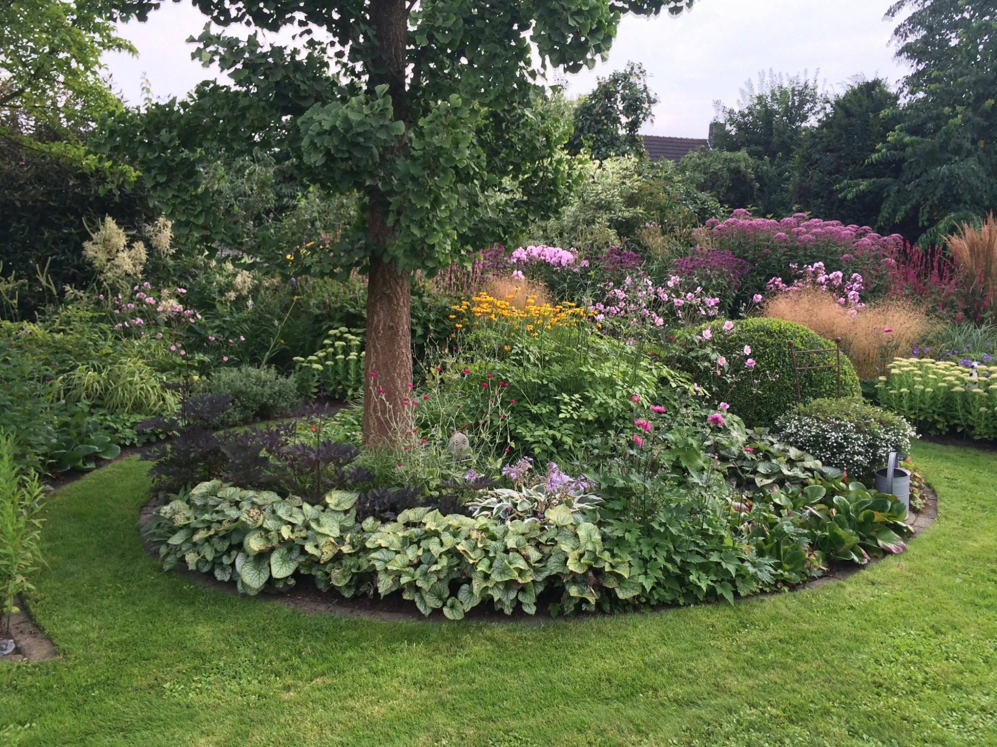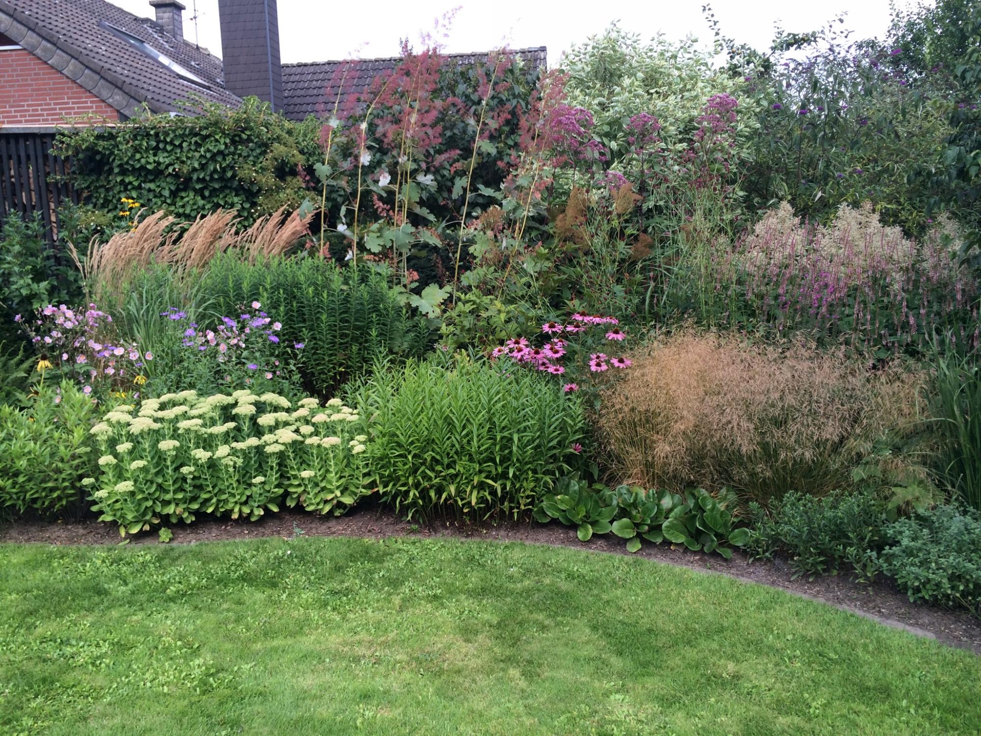 Auf die Empfehlung meiner Staudengärtnerei habe ich die Planung an die Firma Pflanz-Konzept, Britta Telahr übergeben. Frau Telahr hat auf der Basis eines von mir erstellten Grundrisses und einer Pflanzliste der – aus meiner Sicht – erhaltenswerten Altpflanzen einen Pflanzplan erstellt, den ich auf Anhieb mit Freude akzeptiert habe. Bei der Pflanzen- und Standortauswahl wurden sowohl die Bodenbeschaffenheit als auch die Lichtverhältnisse optimal berücksichtigt. Ebenfalls berücksichtigt wurden natürlich die Pflanzhöhen, die Farben und die Blütezeiten.