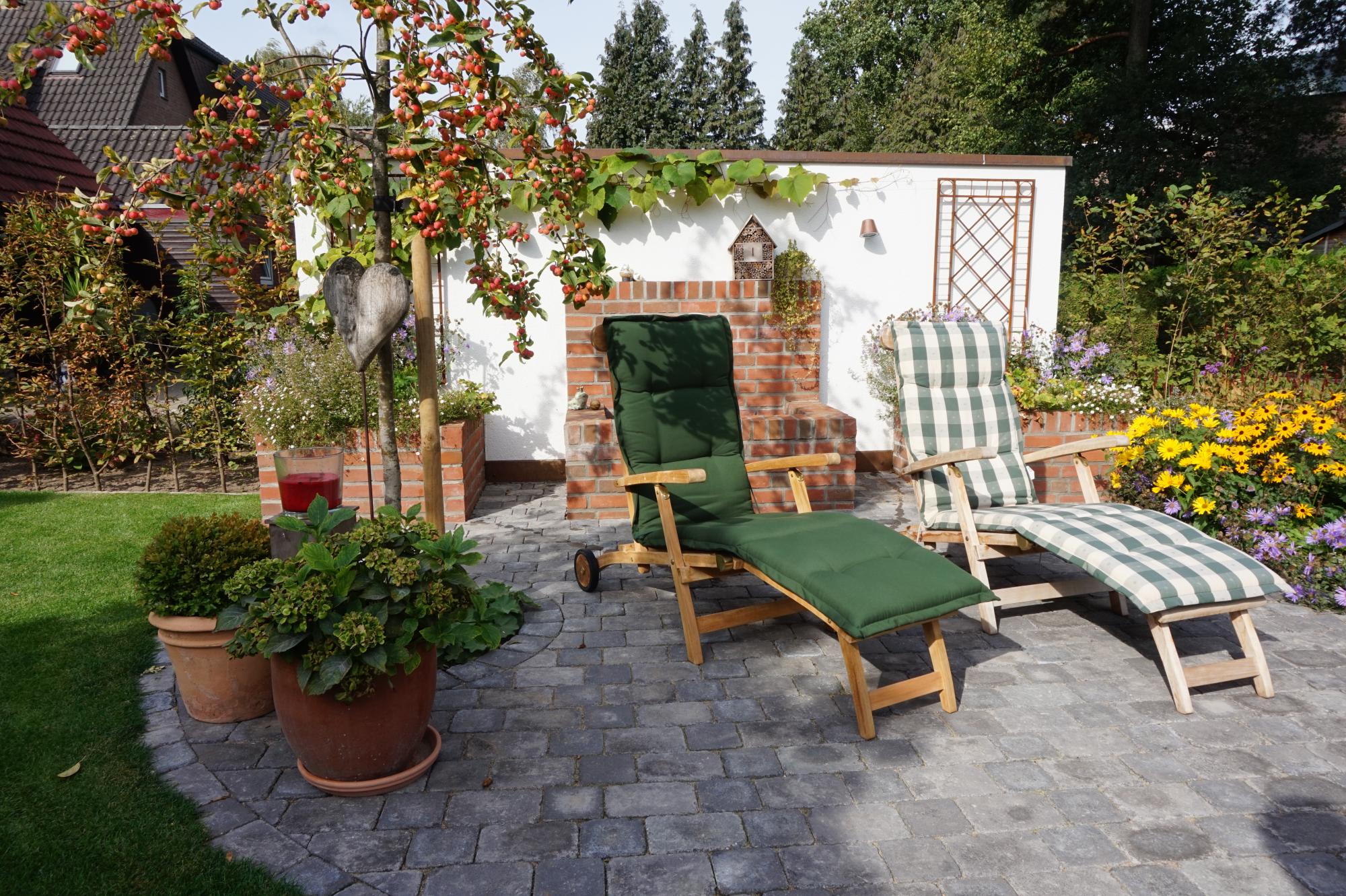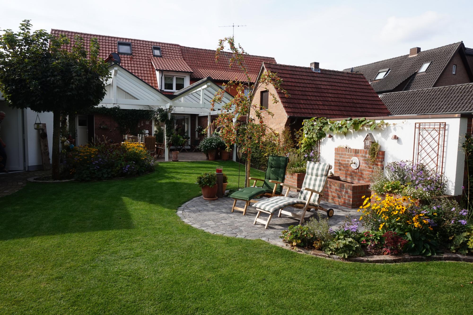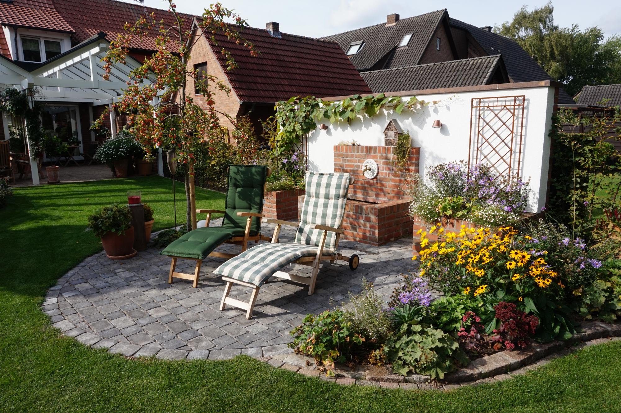 Eine Terrasse mit gemütlichen Sitzmöbeln und attraktiver Überdachung – aber hier fehlt Blühendes ! Das sah das Ehepaar aus Rhede ganz genauso… Nun rahmt ein farbenfrohes Staudenbeet den Sitzplatz an der Terrasse ein – nun fühlt man sich hier wohl. Ein neuer Platz für die Sonnenliegen ist auch entstanden. Eine attraktive Mauer mit schönem Brunnen und Hochbeeten dient als Hintergrund. An der Mauer wird die Weinrebe mit Drähten entlang geleitet. Mit ihrem leuchtend roten Laub ist sind ein Hingucker im Herbst. Ein attraktives Bäumchen schmückt mit kleinen roten Äpfeln den neuen Platz.