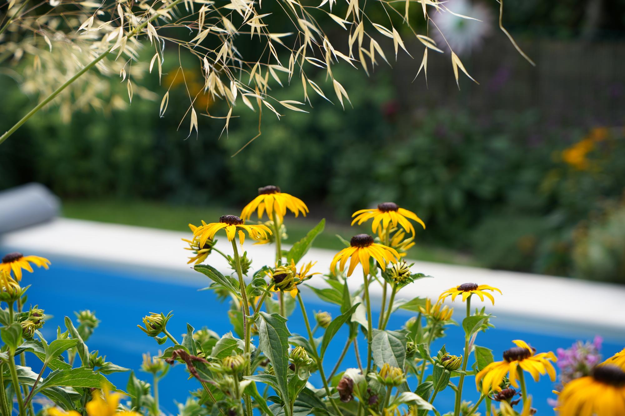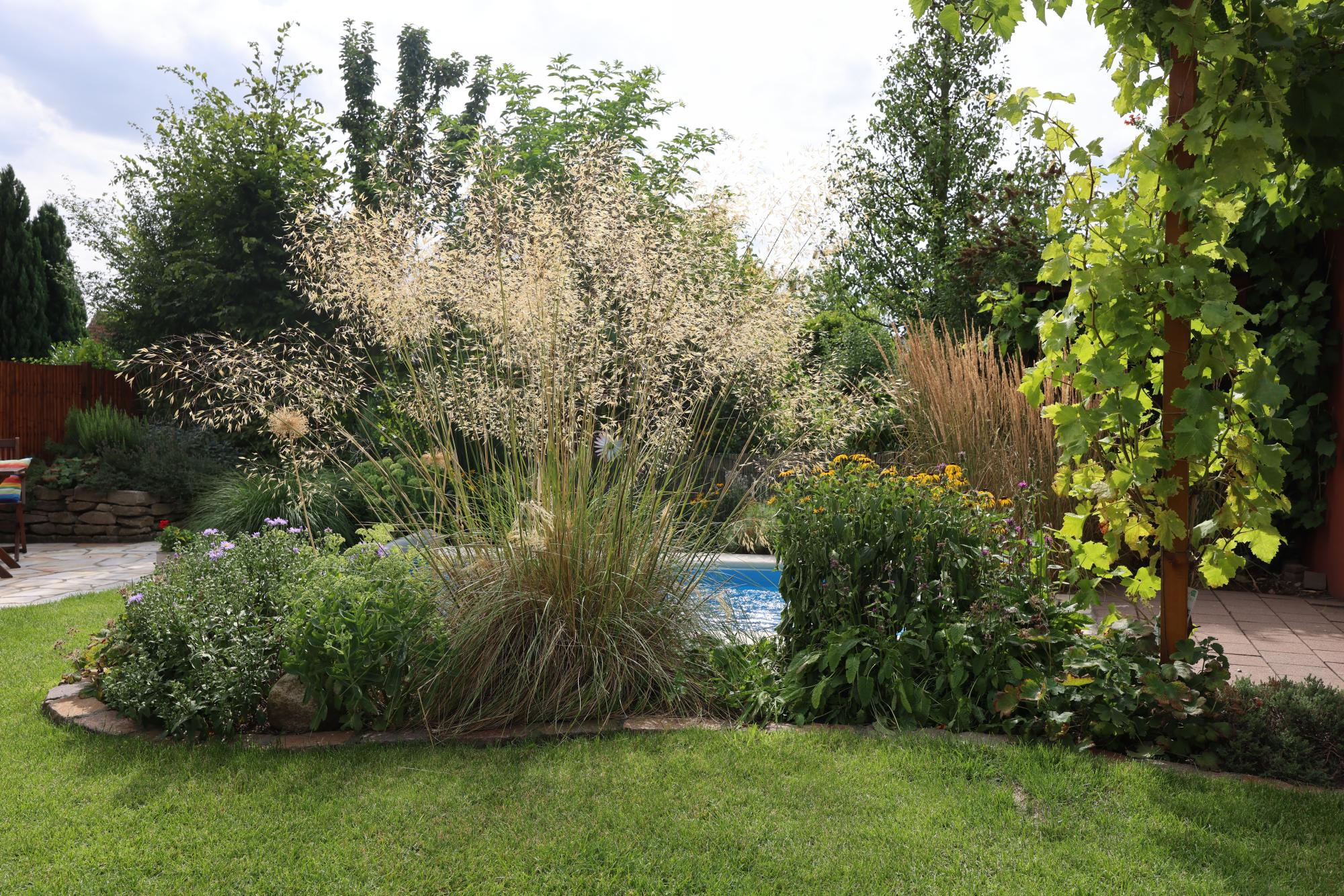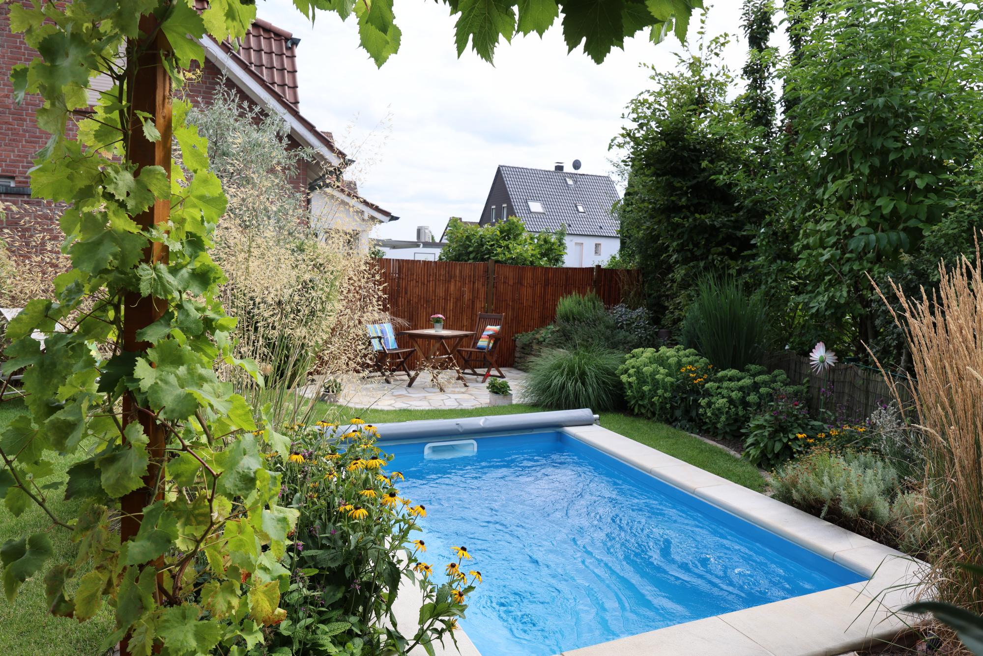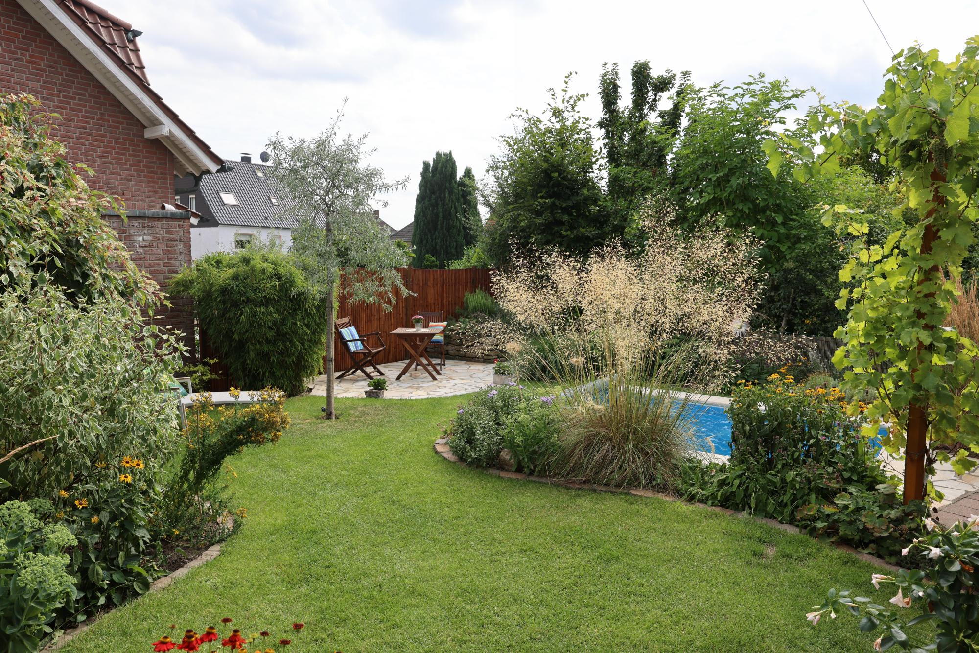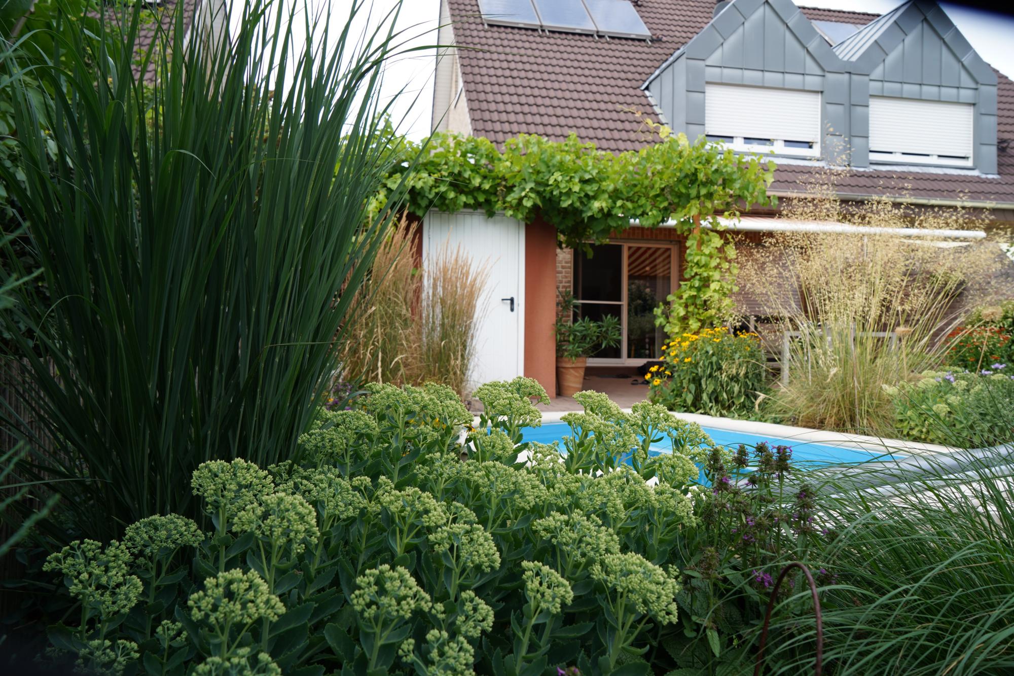 Mittig im Garten wurde ein Beet eingeplant, das durch seine Bepflanzung nun dem Relaxpool den nötigen Sichtschutz gibt.