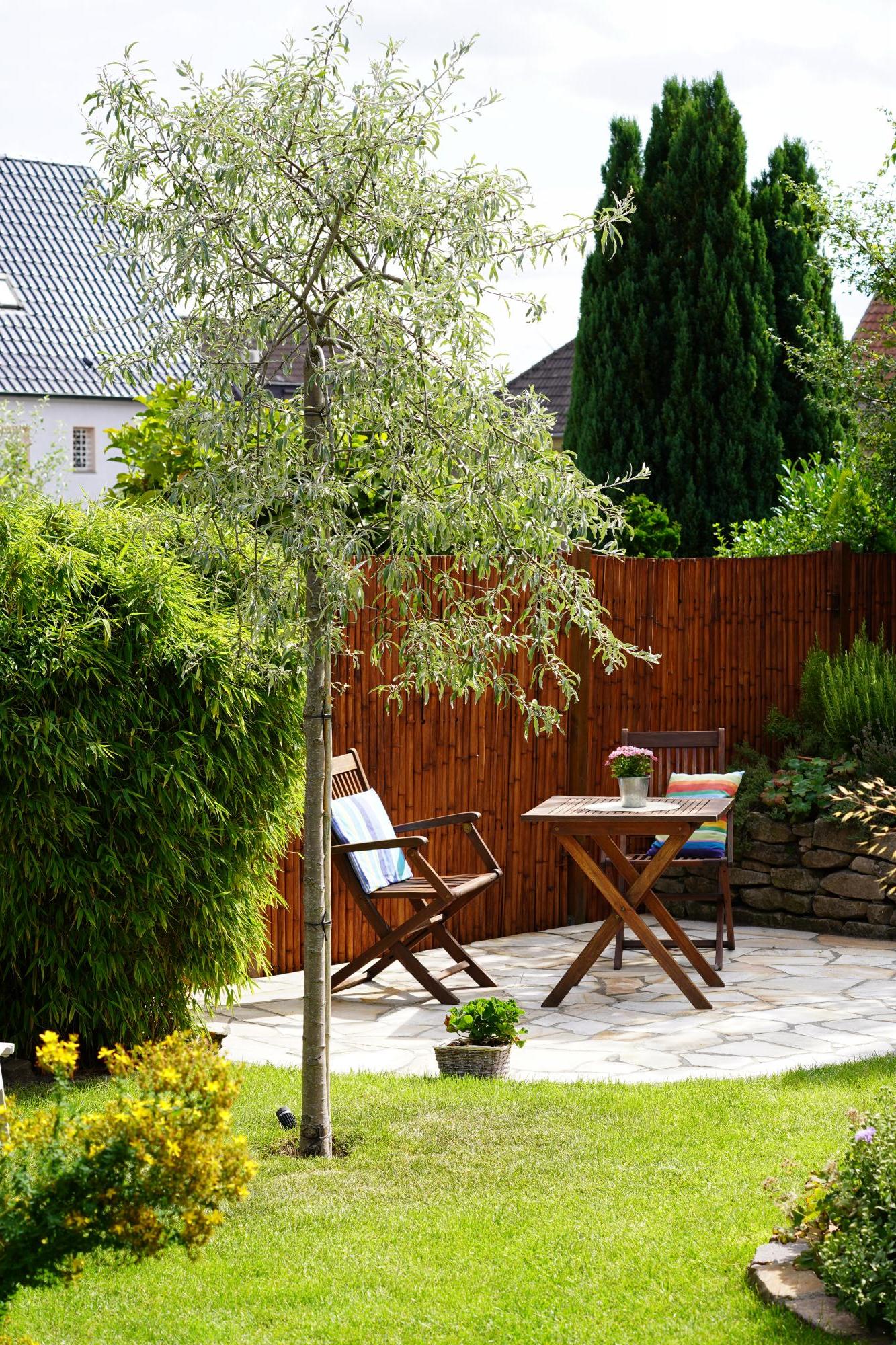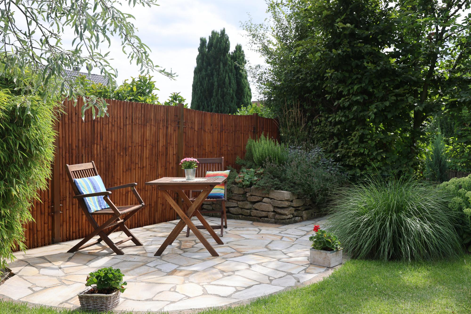 Im hinteren Gartenteil ist ein kleiner Sitzplatz entstanden. Die Kräuter wachsen im schönen Natursteinhochbeet direkt daneben. Ein neu gepflanzter Baum wird zukünftig dem Sitzplatz Schatten spenden, dient aber ebenfalls als Raumbildner.