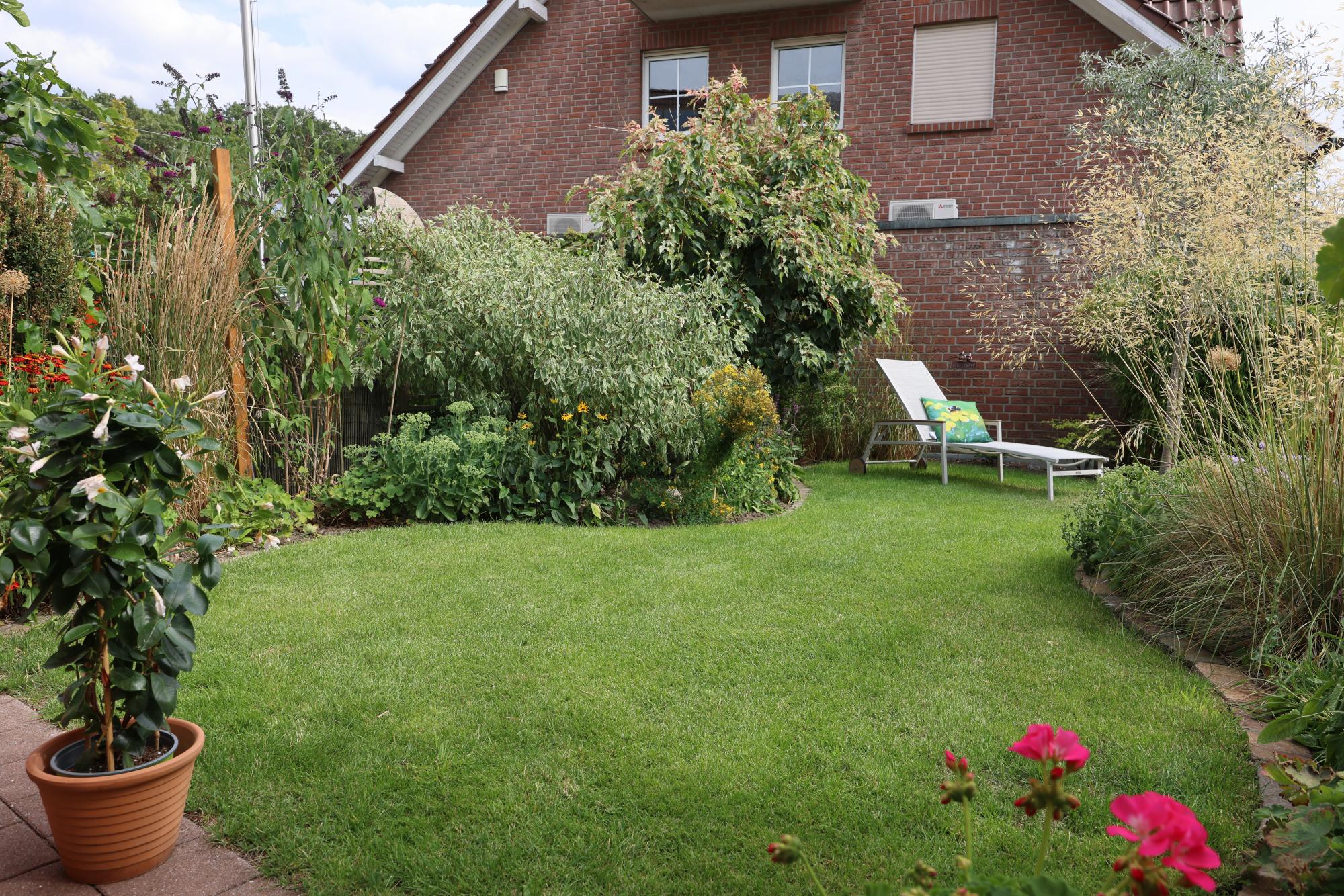 Er teilt den Bereich zur Rasenfläche ab, auf der eine Gartenliege einen schönen Platz findet.