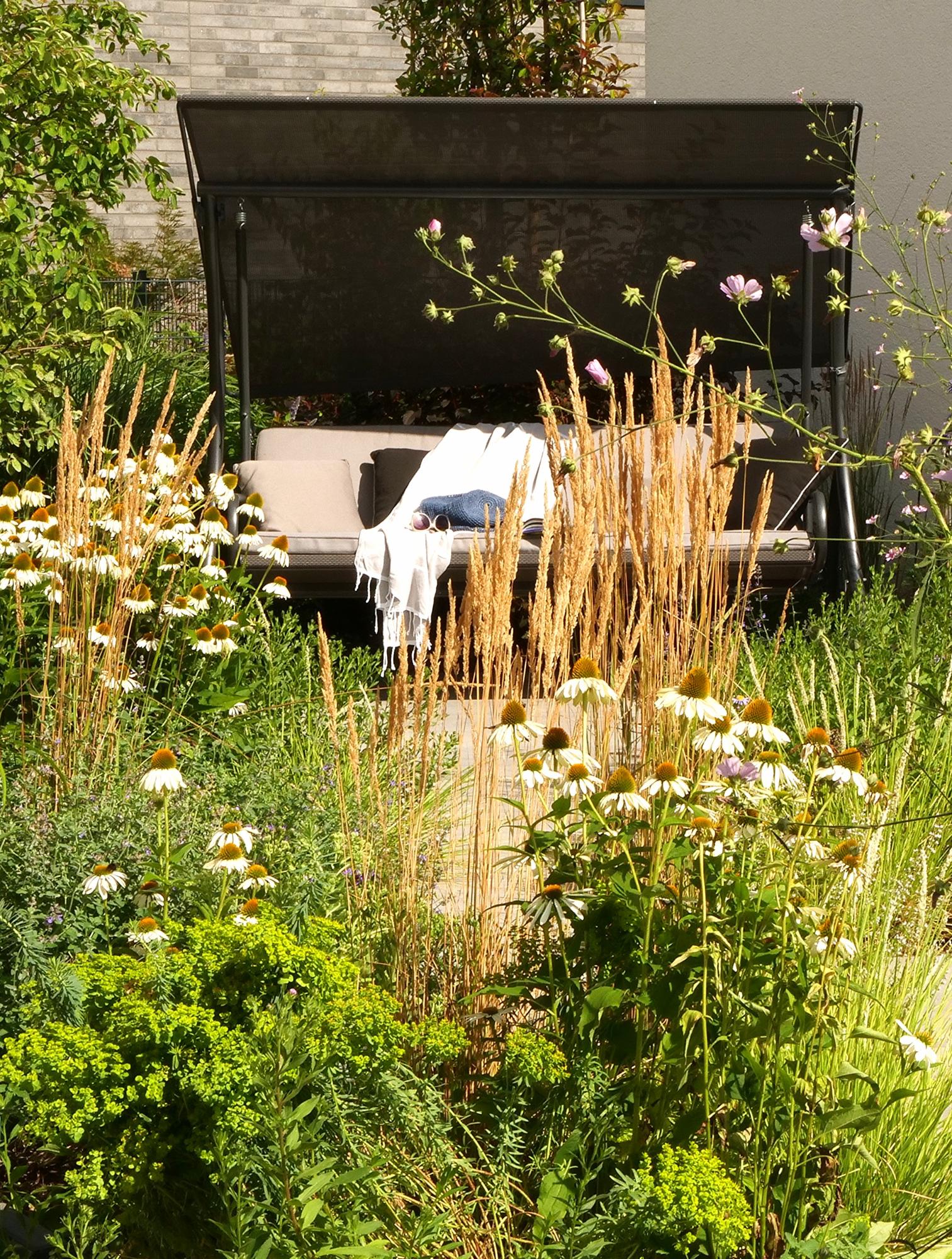 Durch hohe Gräser und Stauden ist ein transparenter Sichtschutz gelungen. Eine mehrstämmige Felsenbirne schirmt die Gartenbesitzerin zu den oberen Etagen des Wohnhauses ab, wenn Sie auf der Hollywoodschaukel sitzt.