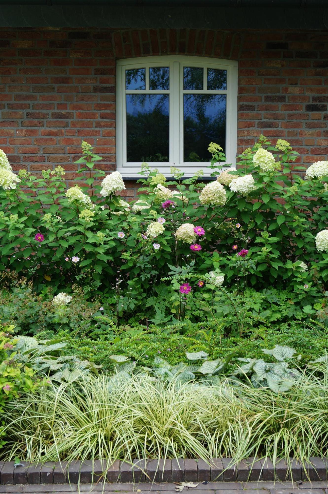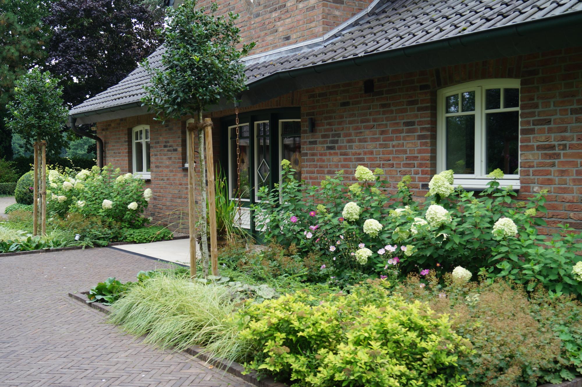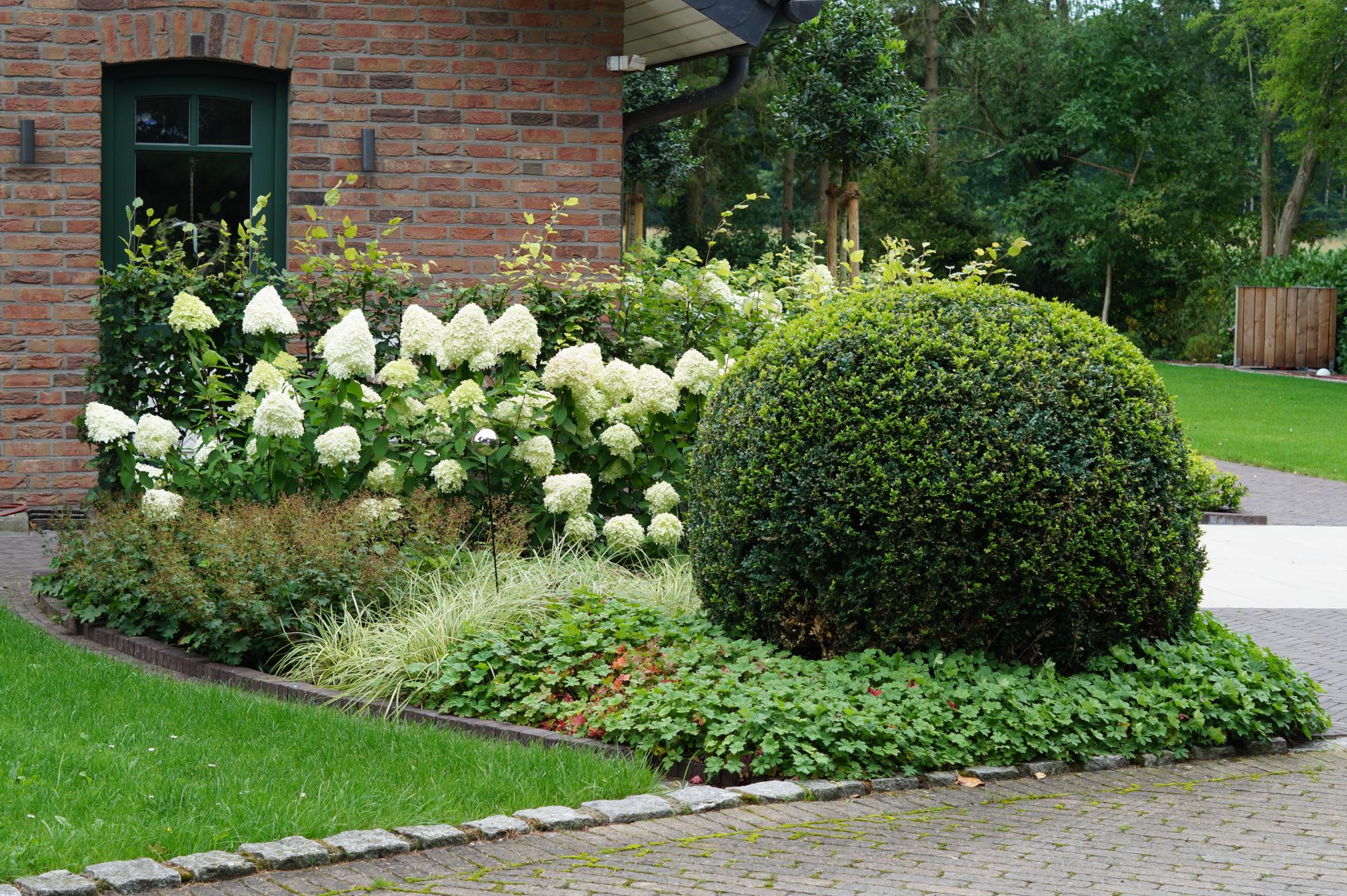Hochwertige Materialien und eine attraktive, sich jahreszeitlich verändernde Bepflanzung geben dem Vorgarten nun einen ganz neuen Look. Durch die bodendeckende Bepflanzung sind die großen Flächen pflegeleicht.