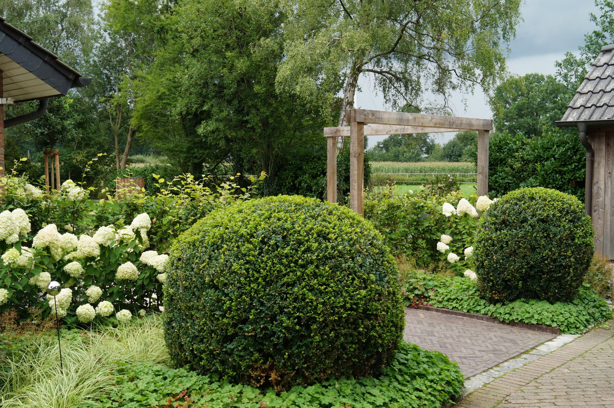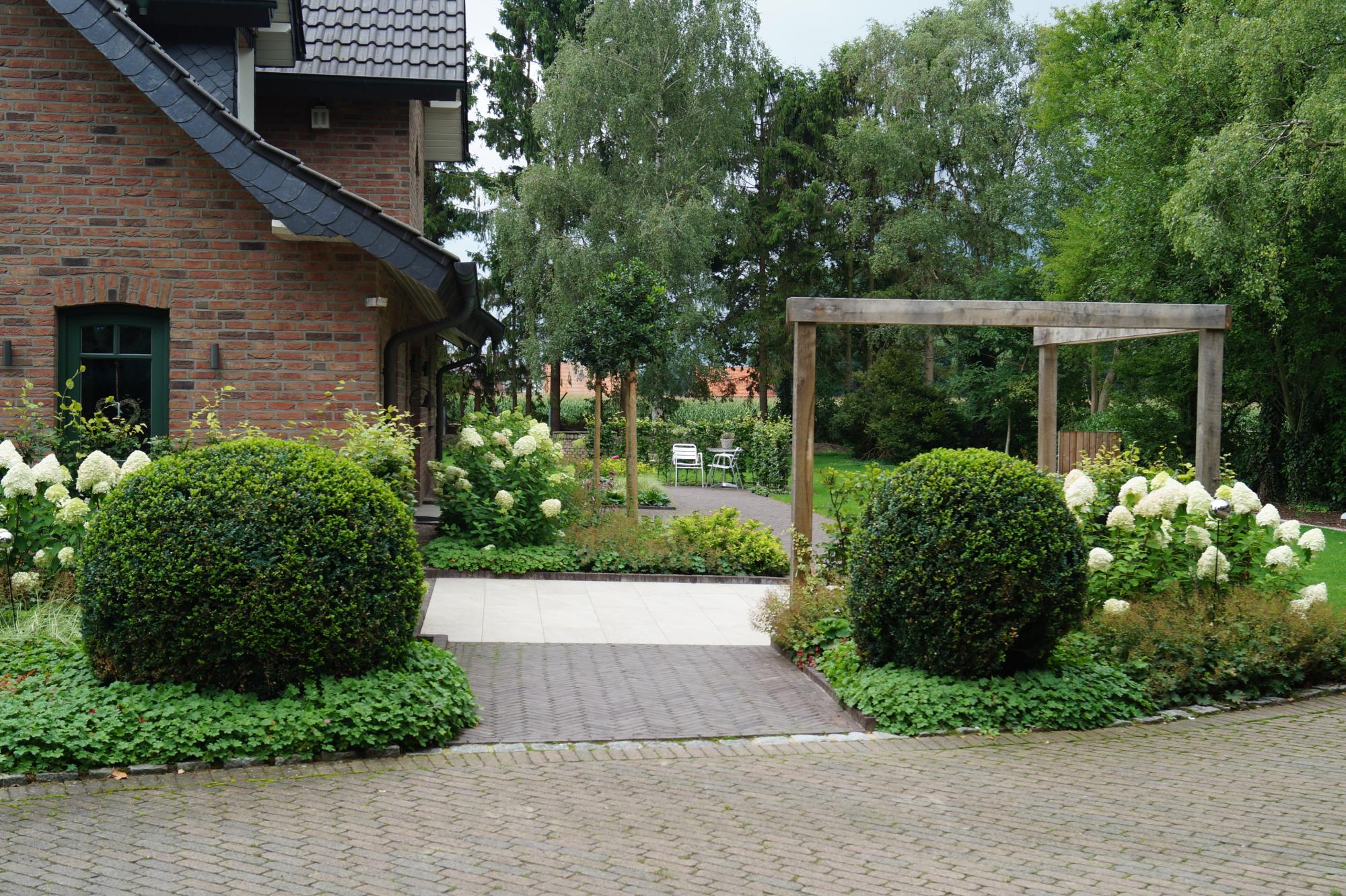 Das ist daraus geworden: Die wunderschönen, alten Buchskugeln konnten als Entrée erhalten werden. Ein gradliniger, breiter Weg führt nun zum Haupteingang. Dieser wird auch durch die beiden Kugelbäume hervorgehoben. Hecken betonen die Ecken des Vorgartens und bilden Räume. Dadurch wird auch der Zugang zur Nebeneingangstür auf den ersten Blick verdeckt. Eine einfache Holzpergola – die noch berankt werden soll – begrenzt einen kleinen Platz, der als Sitzgelegenheit genutzt werden kann.