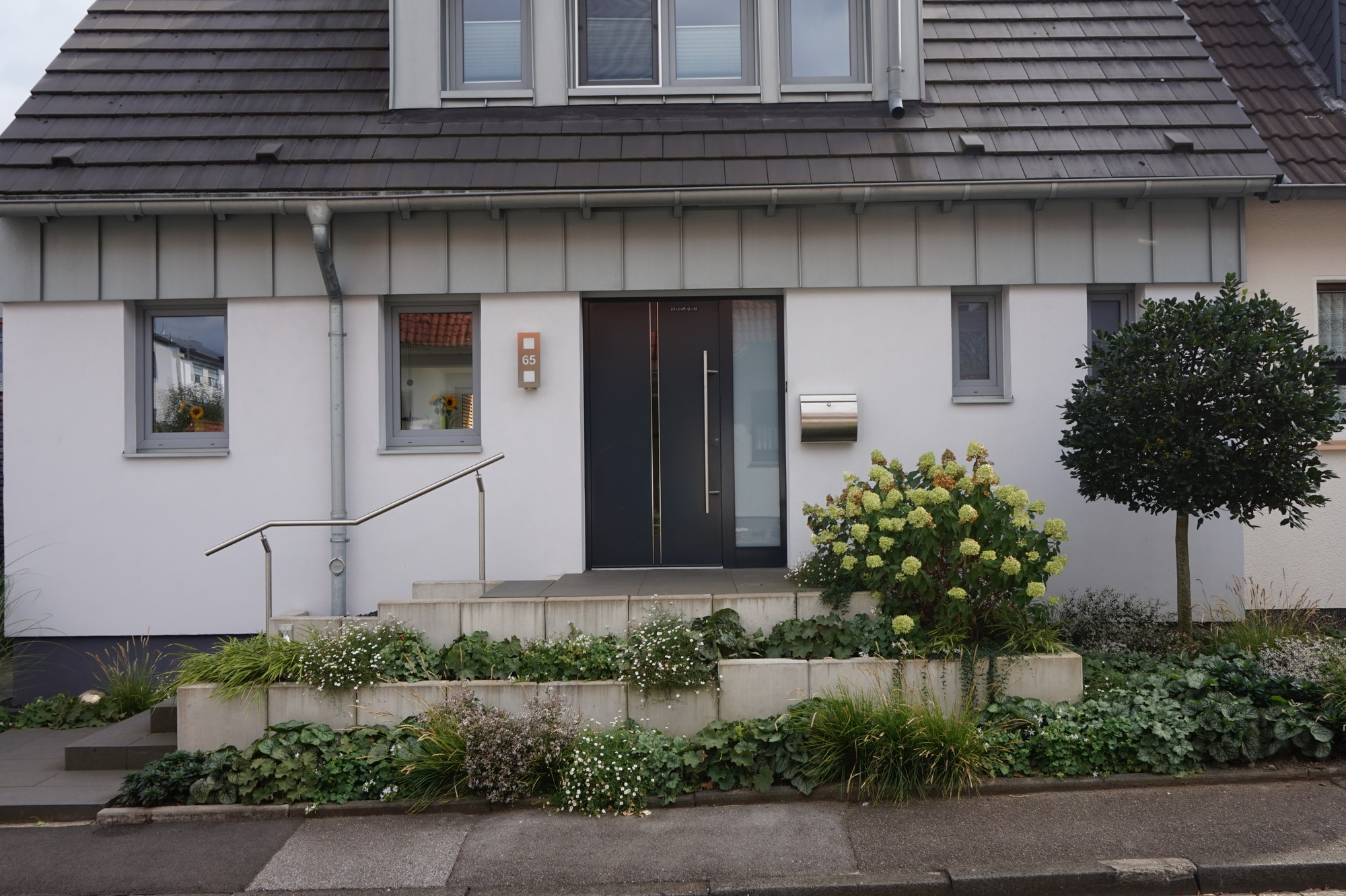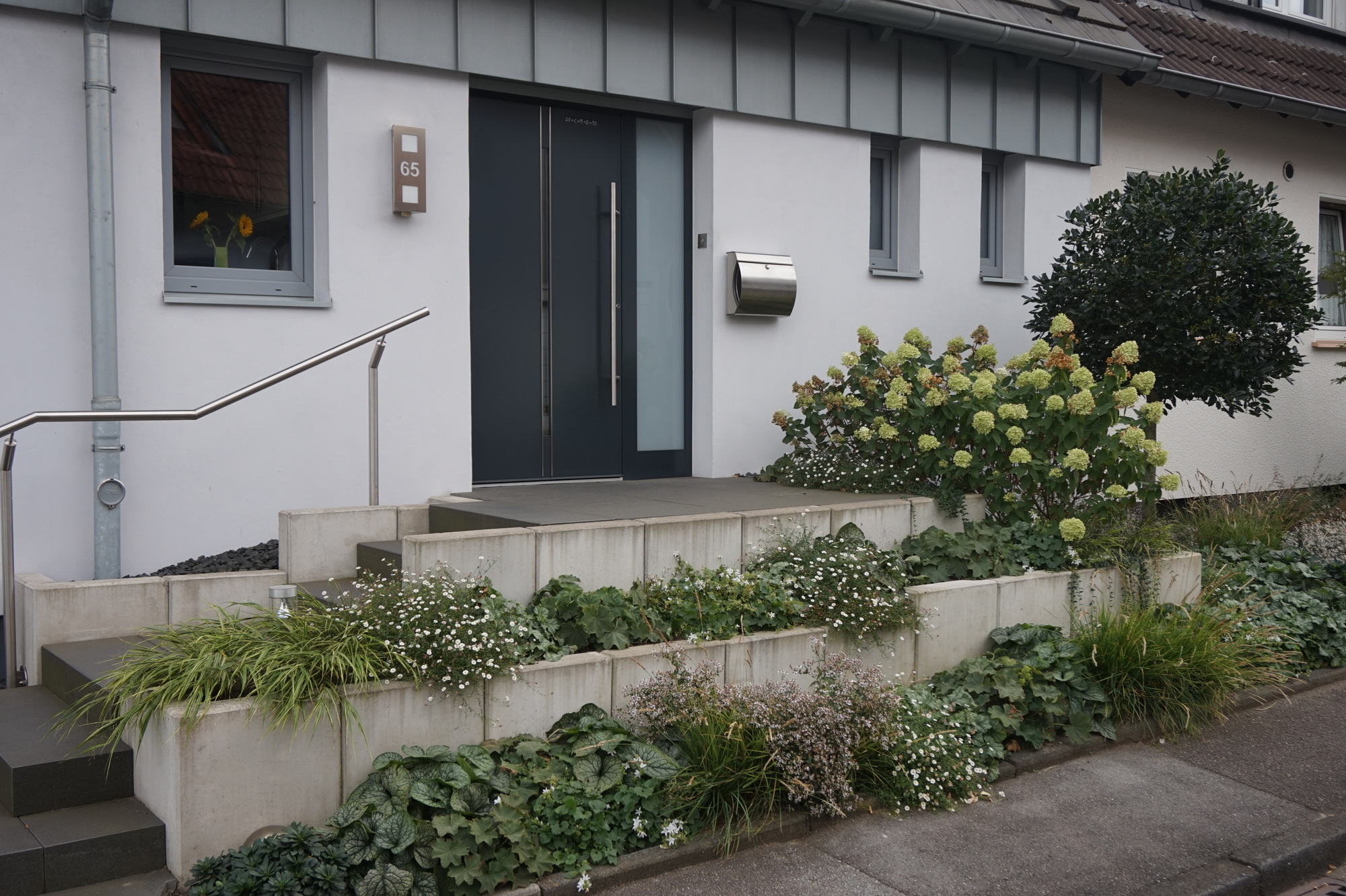 Die Kundin aus Essen wünschte sich eine jahreszeitlich wechselnde Optik für die Bepflanzung.