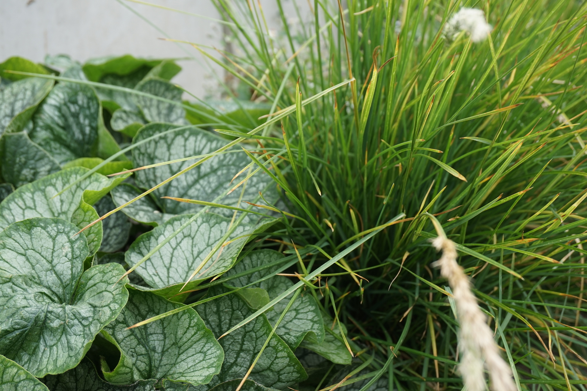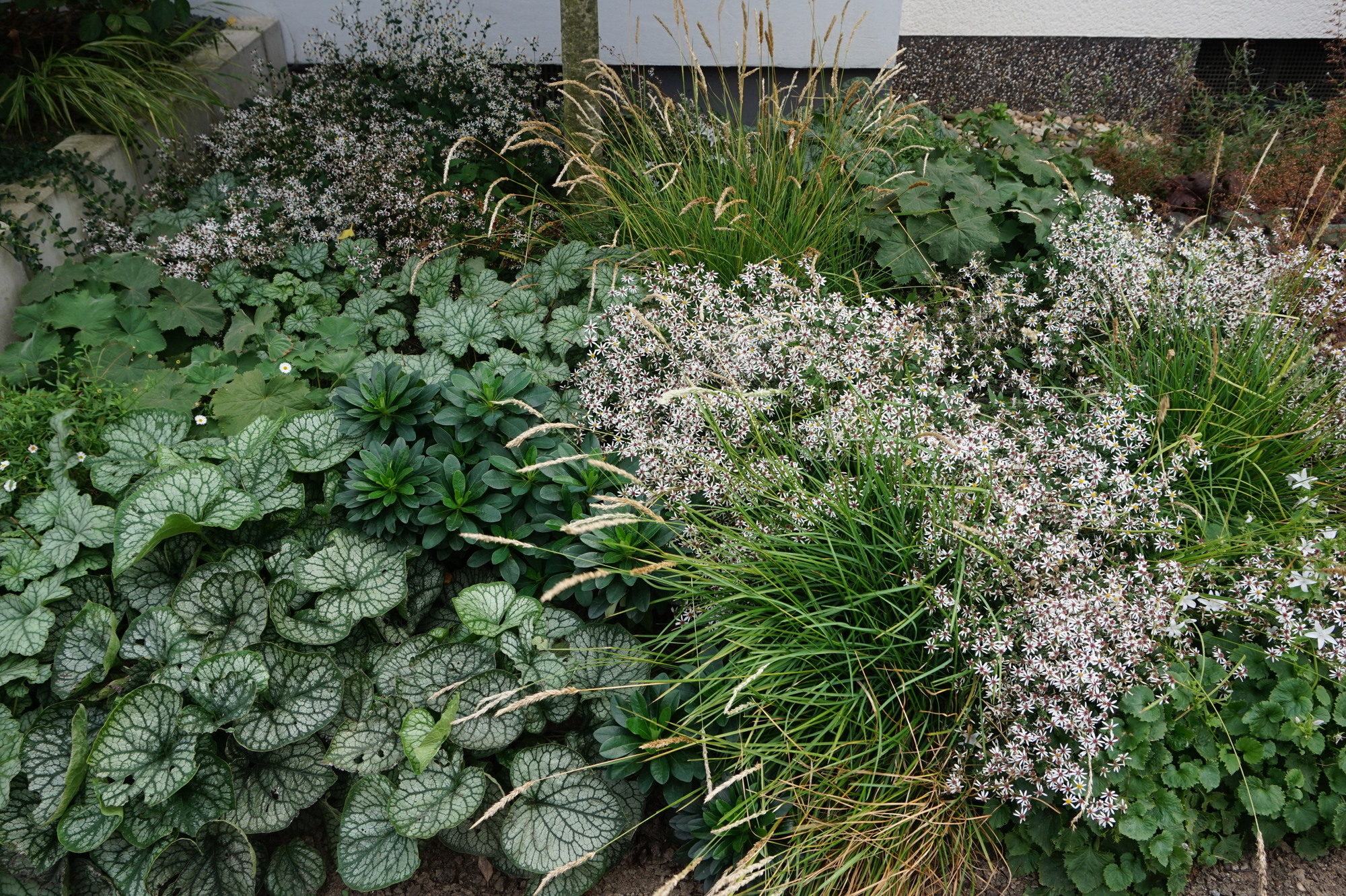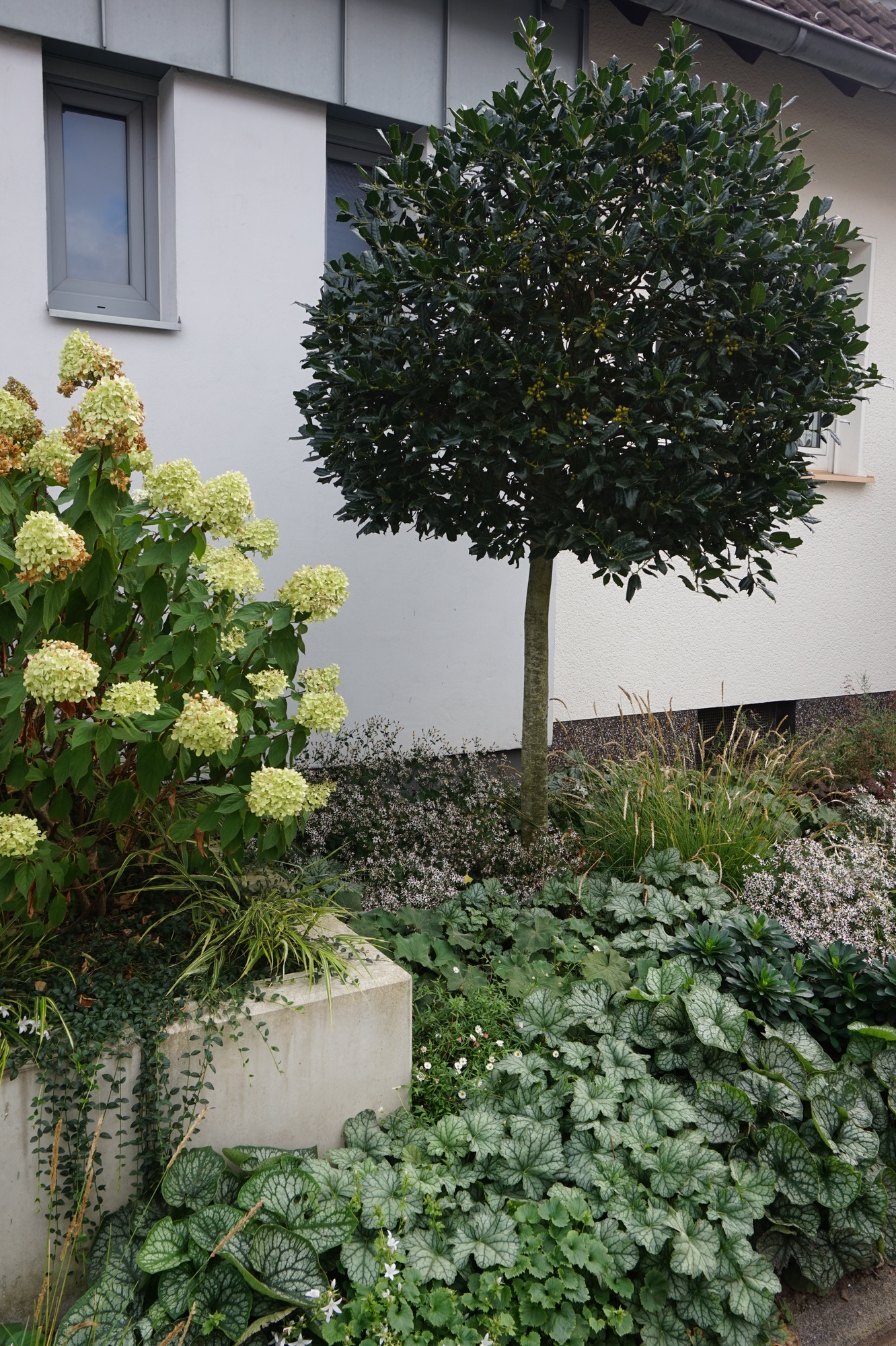 Vorgarten mit Blattschmuckstauden und Gräsern