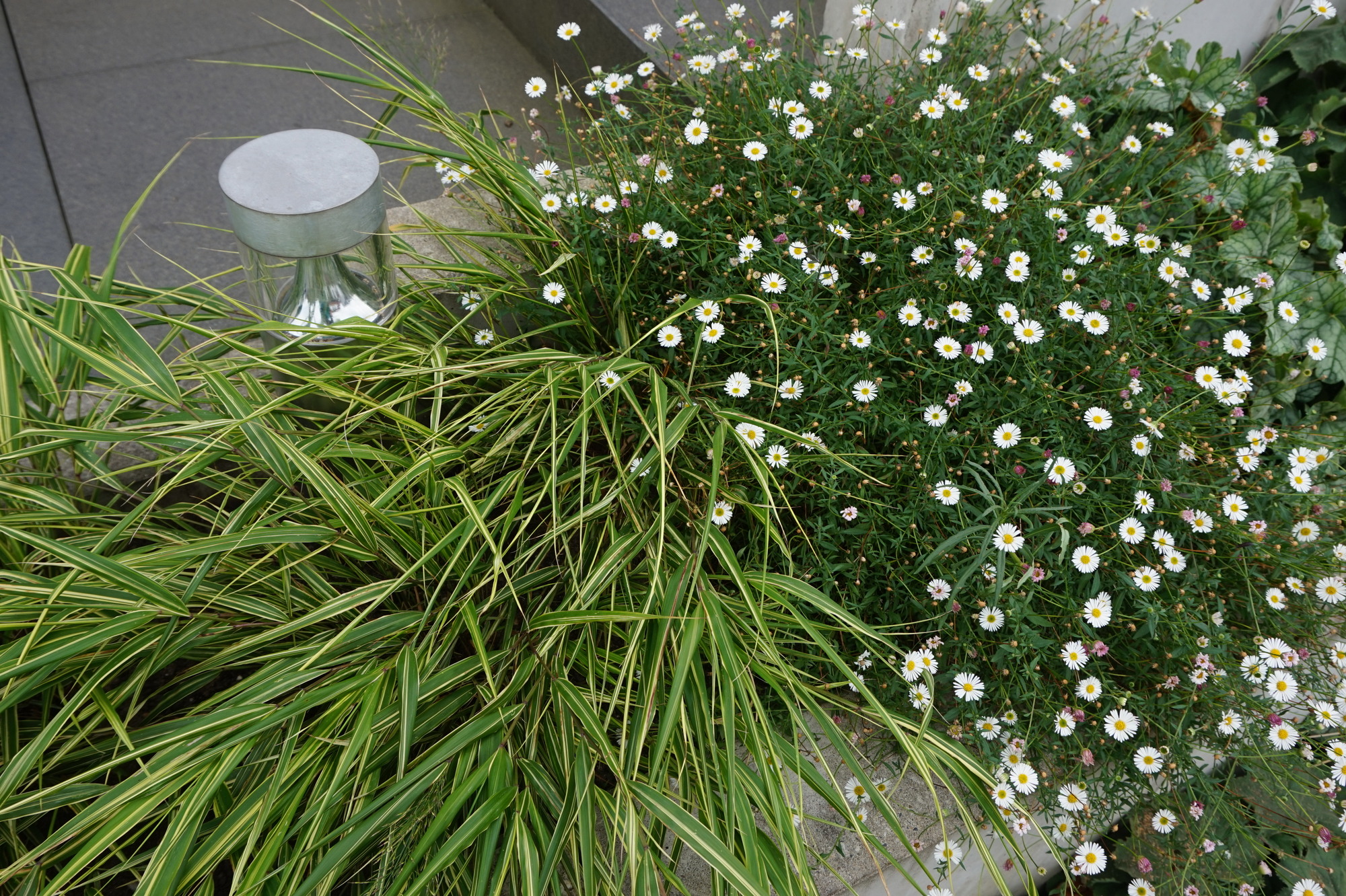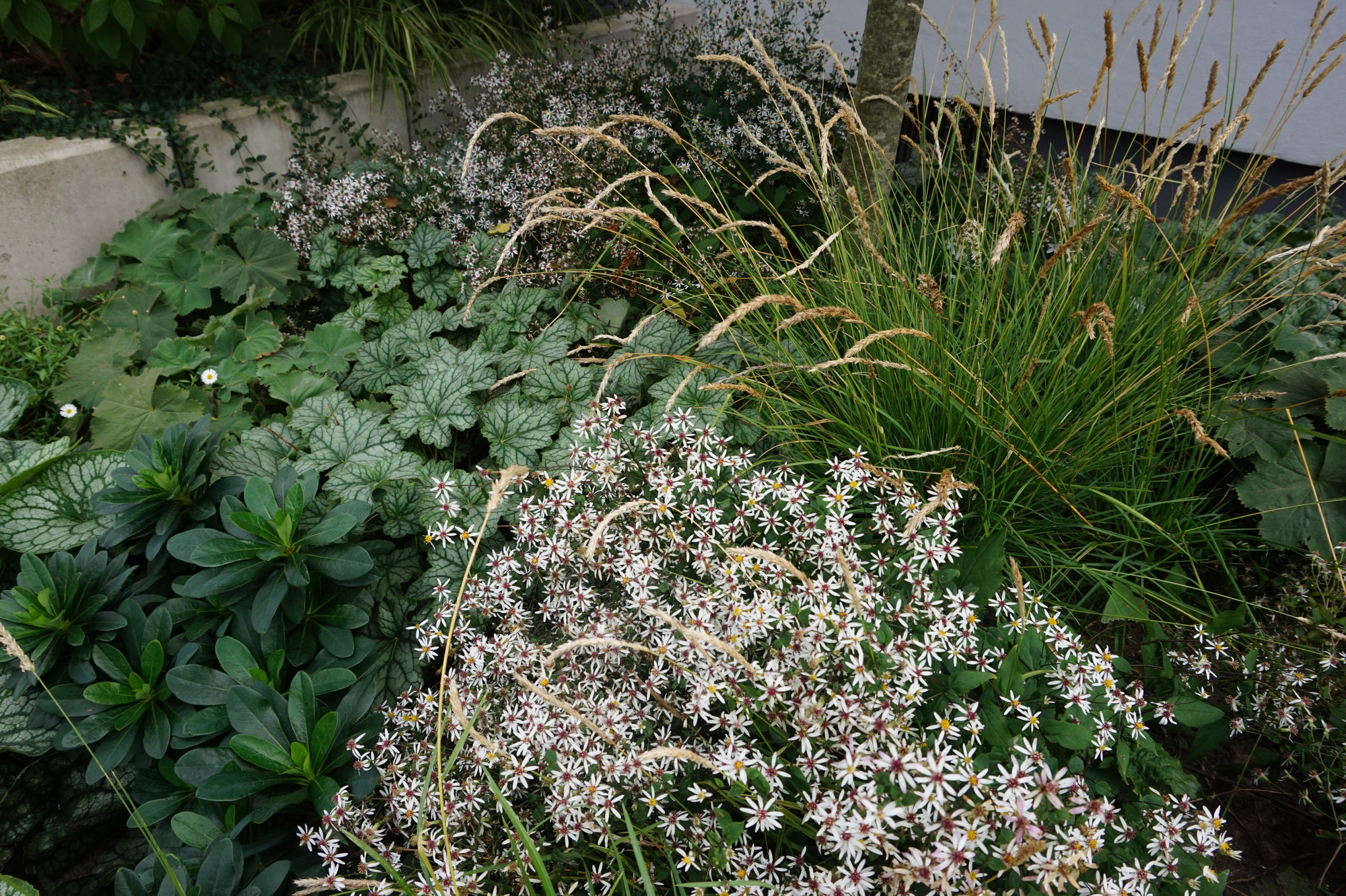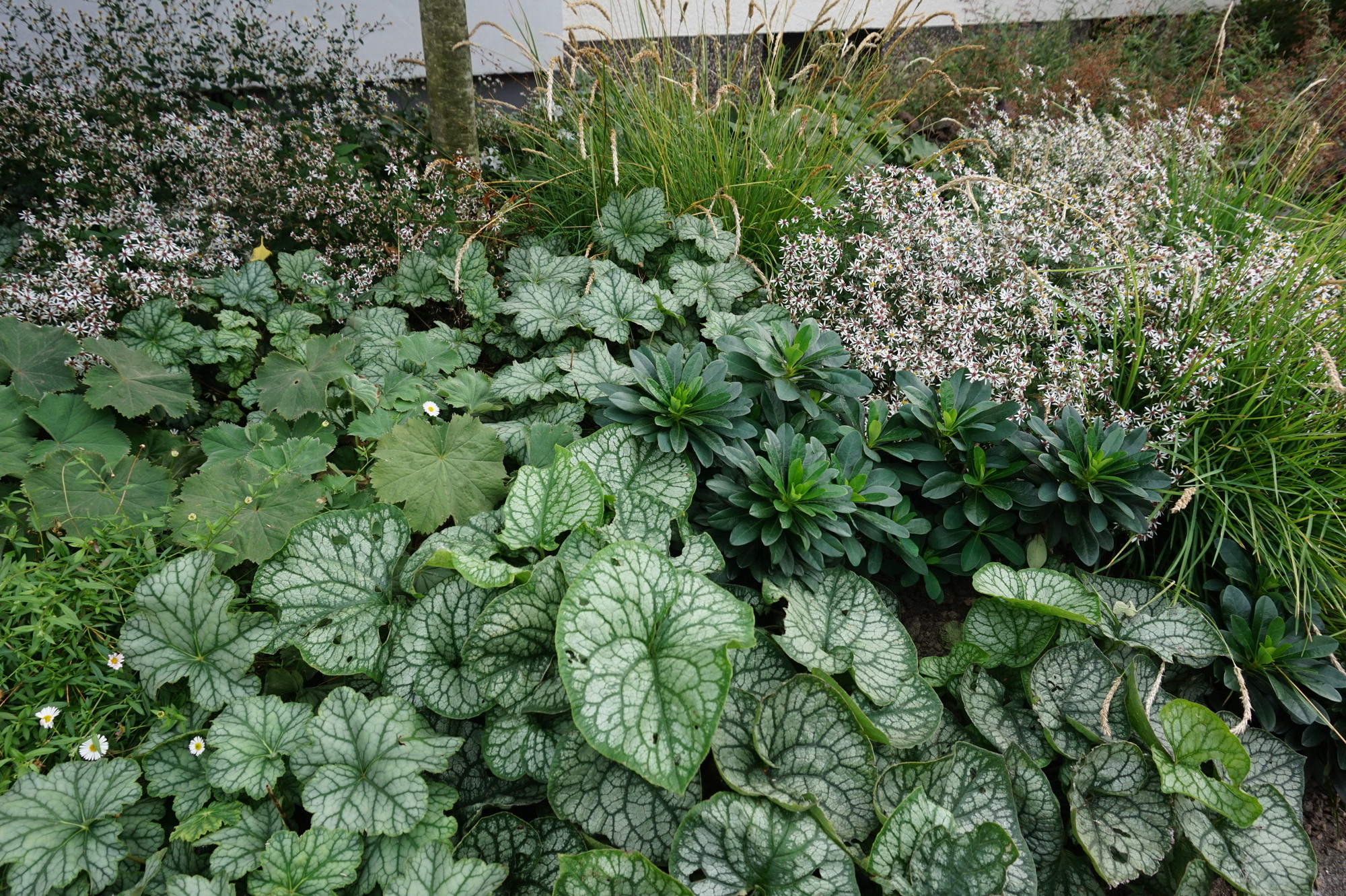 Vorgarten mit Blattschmuckstauden und Gräsern