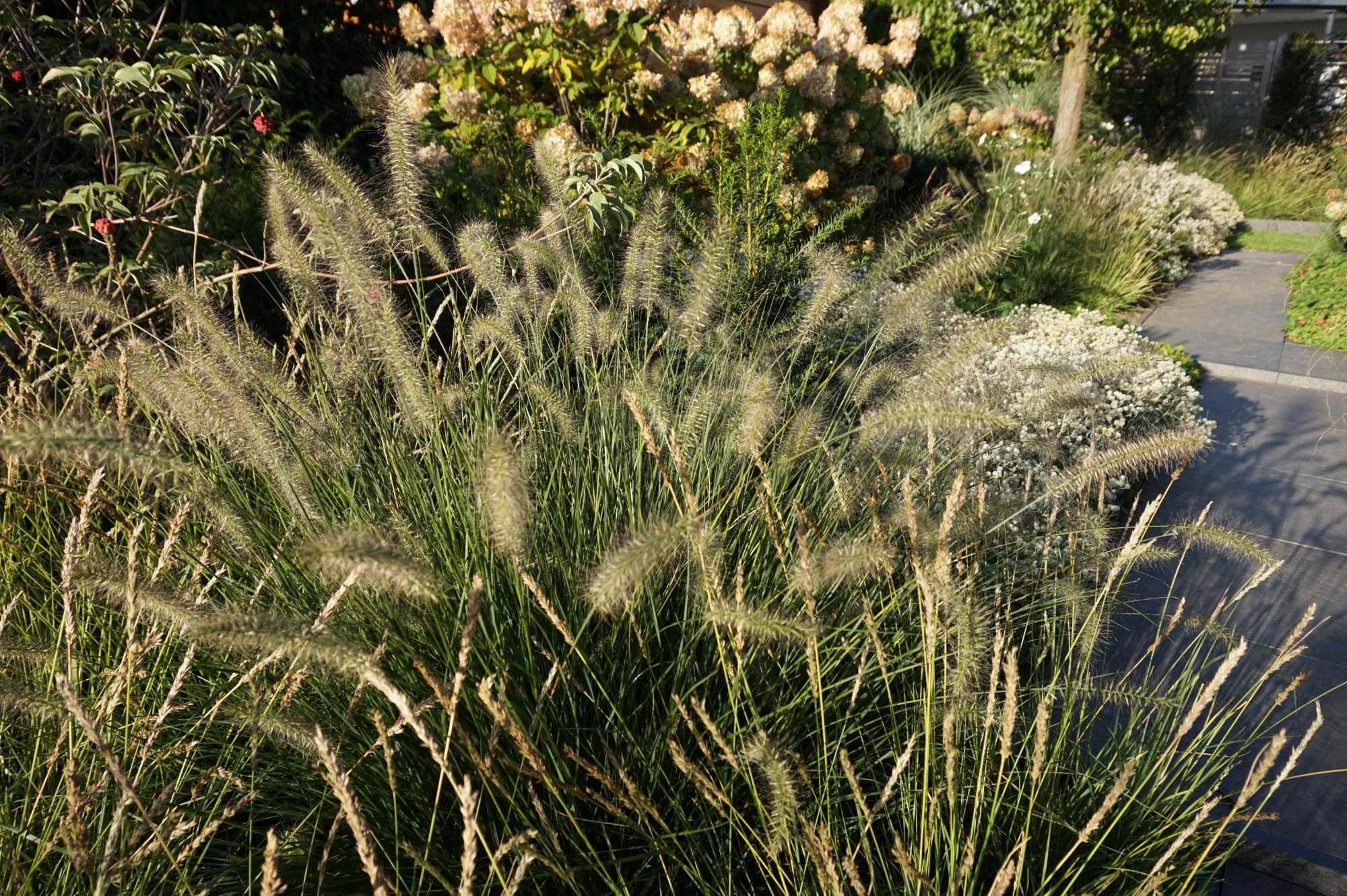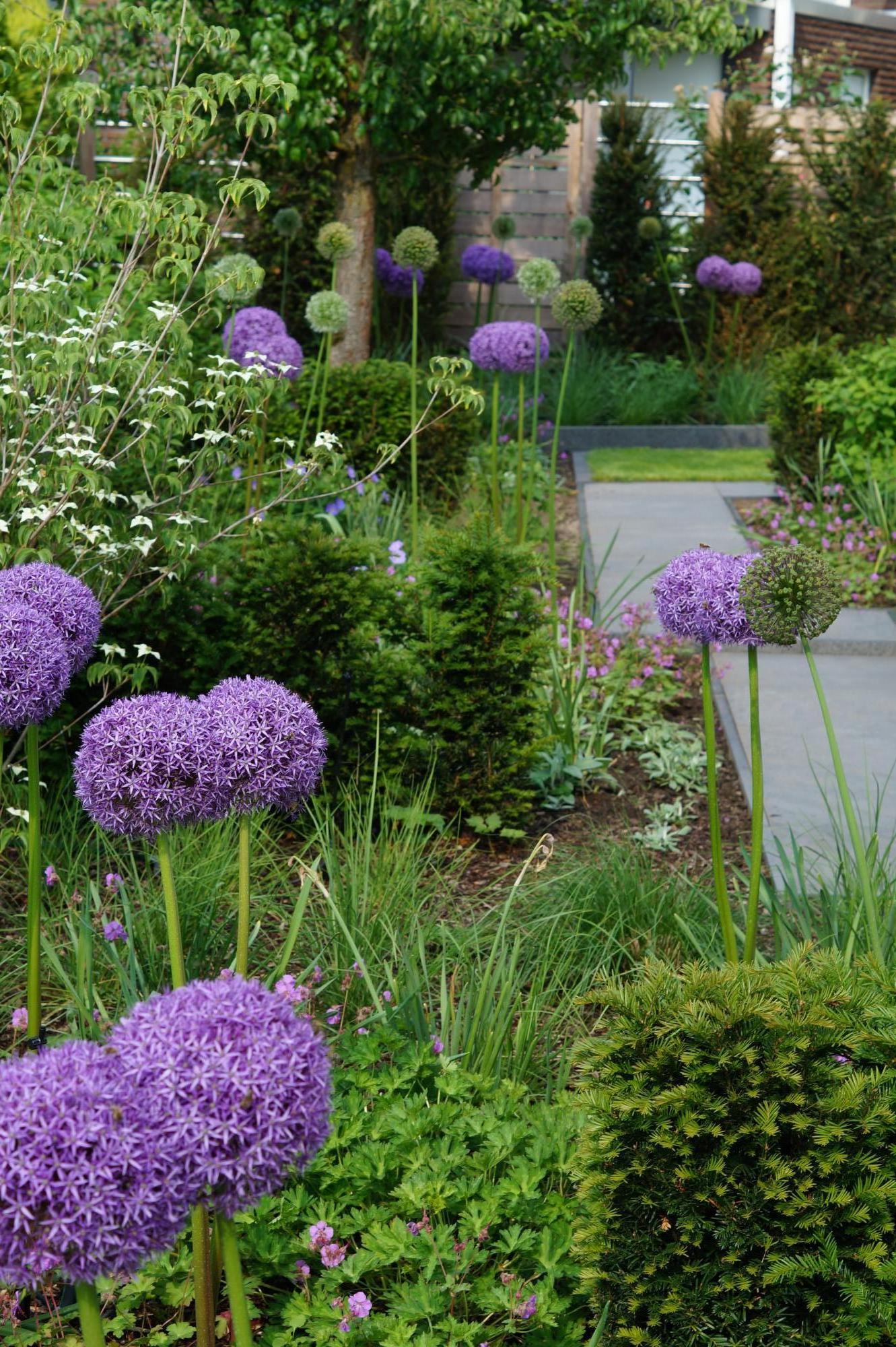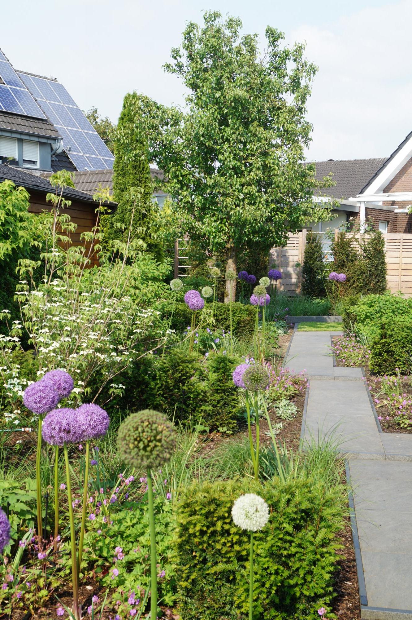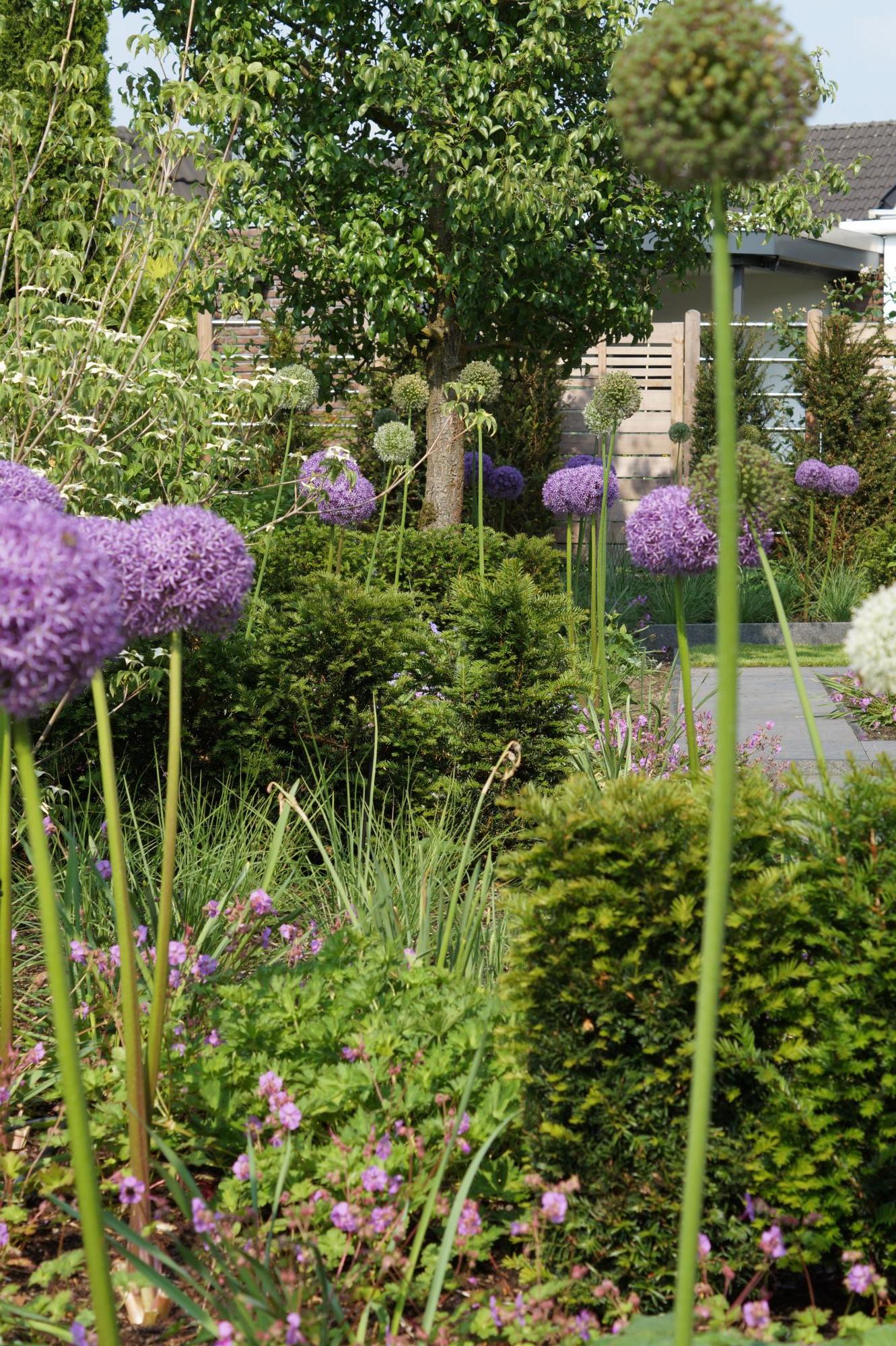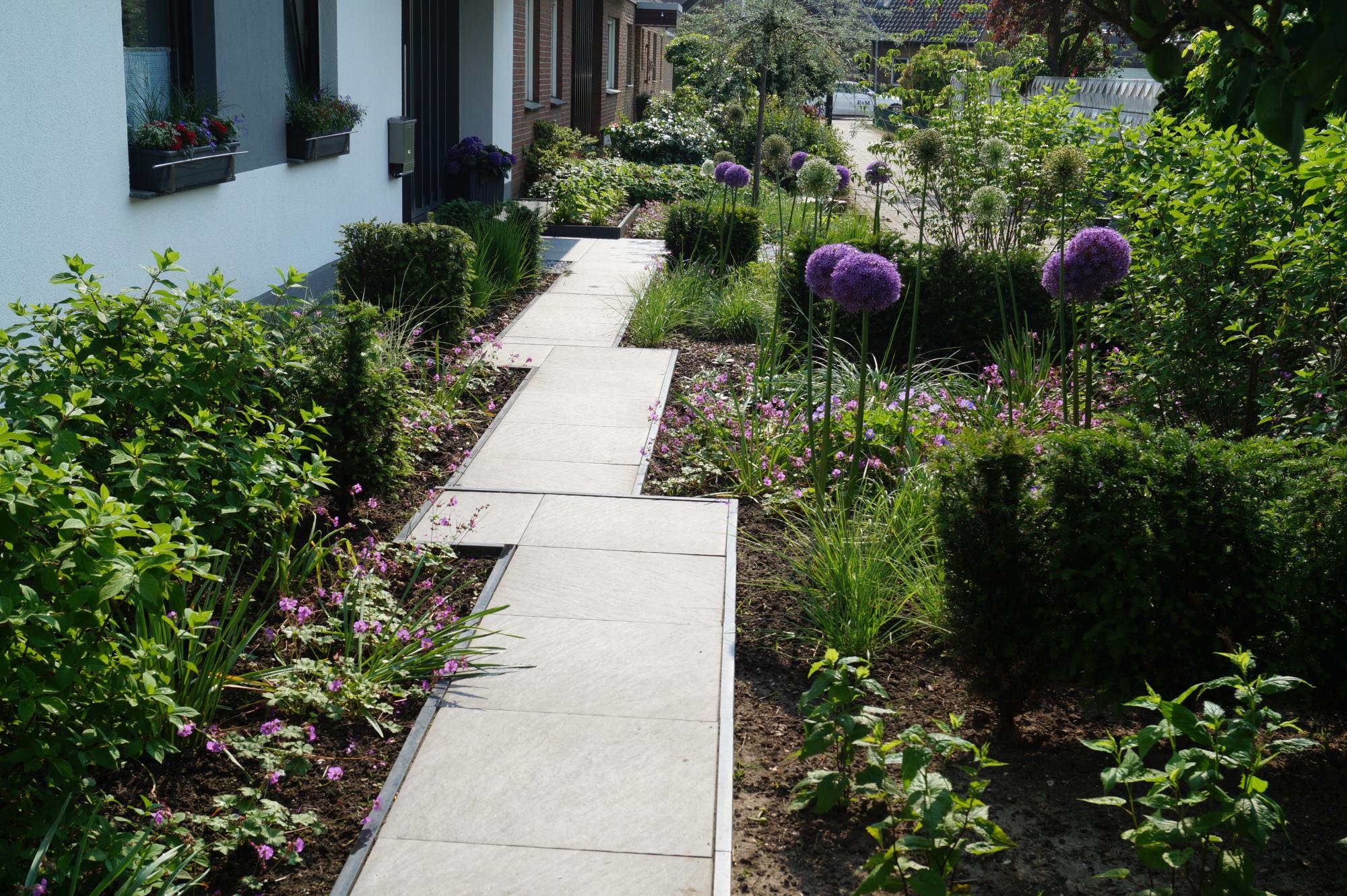 Durch ein gut durchdachtes Pflanzkonzept genießt der Kunde im Frühsommer mit Zierlauch und blühendem Storchschnabel ein völlig anderes Bild als im Spätsommer mit Federborstengras und attraktiven Hortensienbüschen.