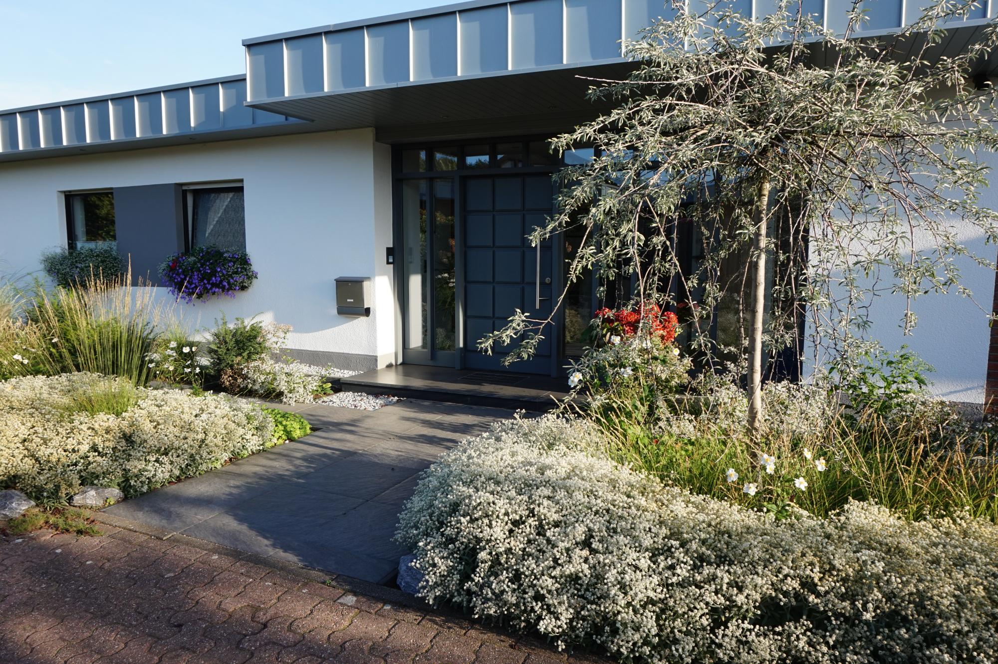 “Wir sind von der wechselnden Optik unseres Vorgartens im Verlauf des Jahres begeistert – sogar im Winter sieht er attraktiv aus. Die Pflanzenauswahl ist abwechslungsreich und der Garten benötigt trotzdem nicht viel Pflege. Durch die Gestaltungsidee den Vorgarten mit Eibenhecken in Beeträume zu unterteilen, bekommt der Garten Struktur. Wir sind sehr zufrieden mit der Arbeit von Frau Telahr.”