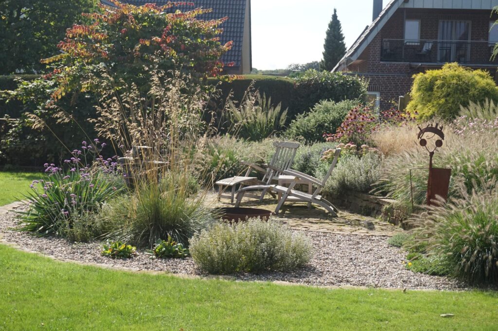 Ein schöner Platz inmitten von Stauden und Gräsern, um die Abendsonne zu genießen. Das war die Vorstellung des jungen Paares aus Rhede und diesen Platz haben wir geplant und verwirklicht…