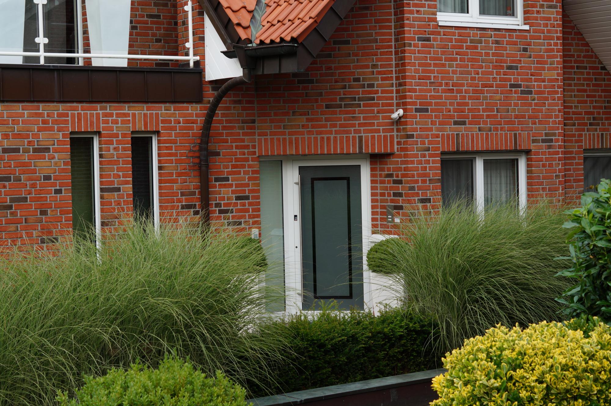 Warum immer viel Geld ausgeben für Mauern und Zäune ? Im Garten oder an der Gartengrenze kann man Sichtschutz auch durch eine gute Auswahl an Pflanzen erreichen. Hier ist es ein schönes Beispiel eines Vorgartens, der zum Nachbarn durch ein attraktives Gras abgetrennt wird. In Reihe gepflanzt, wirkt es wie eine Hecke. Die Kombination mit immergrünen, in Form geschnittenen Heckenelementen schafft Spannung und erlaubt einige (gewollte) Durchblicke.