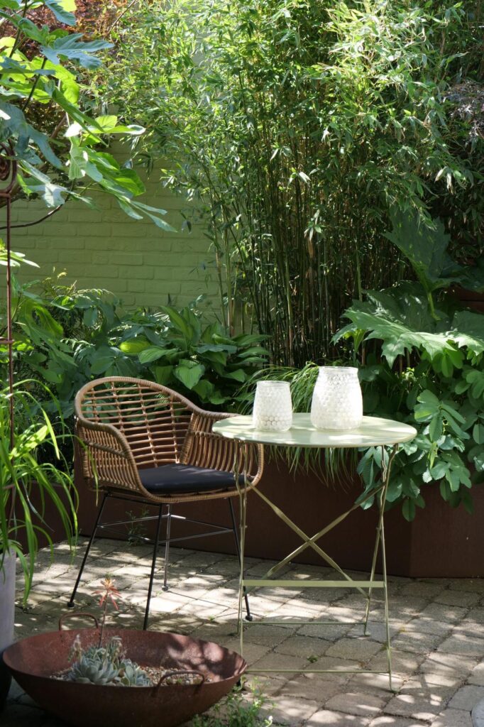 Ein Hochbeet aus Cortenstahl bringt Höhe und sorgt für eine Raumwirkung.